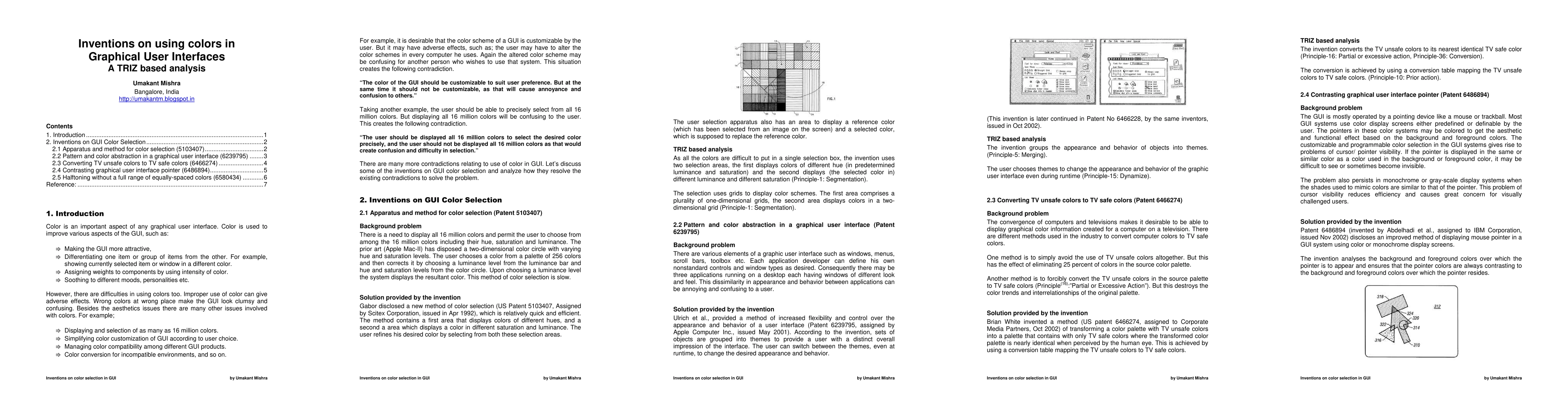 Color is an important aspect of any graphical user interface (GUI). Color is used to make a GUI attractive and meaningful. But there are difficulties in using colors too. Improper use of color can result in adverse effects. Wrong colors at wrong place can make the GUI look clumsy and confusing. Apart from the aesthetics issues there are many other issues involved with colors too. One of the contradictions relating to usage of color is "The color of the GUI should be customizable to suit user preference. But at the same time it should not be customizable, as that would cause annoyance and confusion to other users." Another contraction relating to using color is "The user should be displayed all 16 million colors to select the desired color precisely, But from another angle the user should not be displayed all 16 million colors as that would create confusion and difficulty in selection." This article analyses some inventions selected from US Patent database and illustrates how the inventors have been able to solve various contradictions relating to usage of colors in Graphical User Interface.