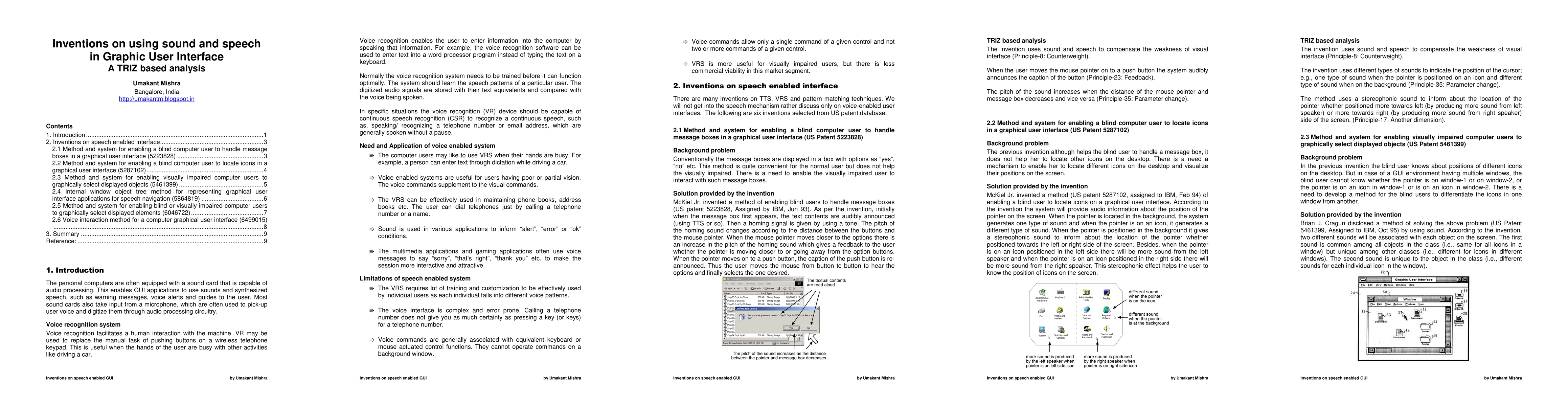 Voice Recognition (VR) facilitates a human interaction with the machine. VR may be used to replace the manual task of pushing buttons on a wireless telephone keypad. This is particularly useful when the hands of the user are busy with other activities like driving a car. However, the VRS system has several limitations. The VRS requires lot of training and customization in order to be effectively used by individual users as each individual falls into different voice patterns. Besides the voice interface is complex and is not as reliable as the keyboard or mouse. This article illustrates some interesting inventions on using sound and voice in Graphical User Interfaces.