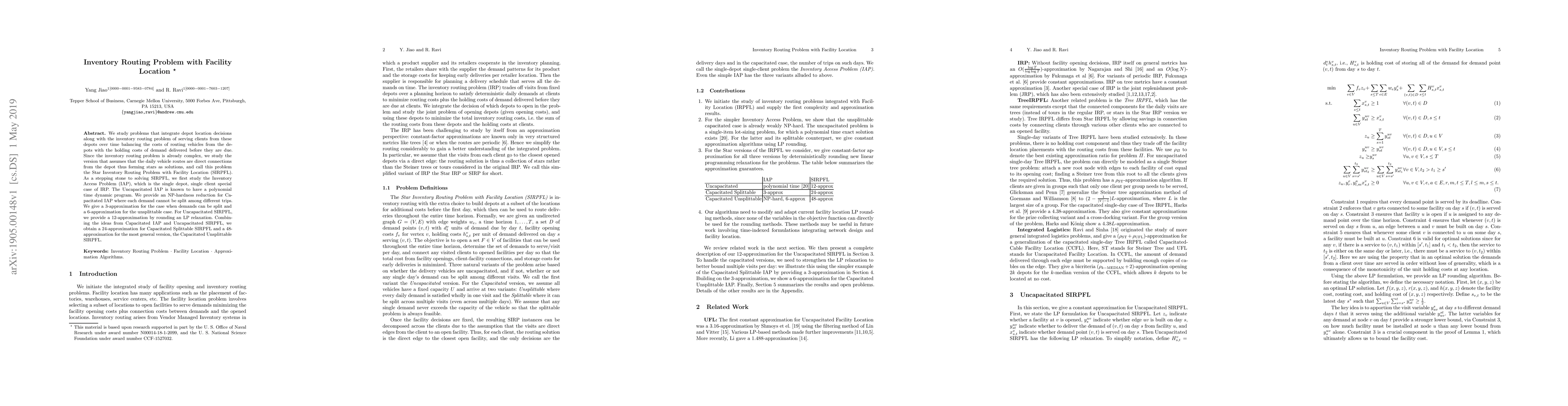 We study problems that integrate depot location decisions along with the inventory routing problem of serving clients from these depots over time balancing the costs of routing vehicles from the depots with the holding costs of demand delivered before they are due. Since the inventory routing problem is already complex, we study the version that assumes that the daily vehicle routes are direct connections from the depot thus forming stars as solutions, and call this problem the Star Inventory Routing Problem with Facility Location (SIRPFL). As a stepping stone to solving SIRPFL, we first study the Inventory Access Problem (IAP), which is the single depot, single client special case of IRP. The Uncapacitated IAP is known to have a polynomial time dynamic program. We provide an NP-hardness reduction for Capacitated IAP where each demand cannot be split among different trips. We give a $3$-approximation for the case when demands can be split and a $6$-approximation for the unsplittable case. For Uncapacitated SIRPFL, we provide a $12$-approximation by rounding an LP relaxation. Combining the ideas from Capacitated IAP and Uncapacitated SIRPFL, we obtain a $24$-approximation for Capacitated Splittable SIRPFL and a $48$-approximation for the most general version, the Capacitated Unsplittable SIRPFL.