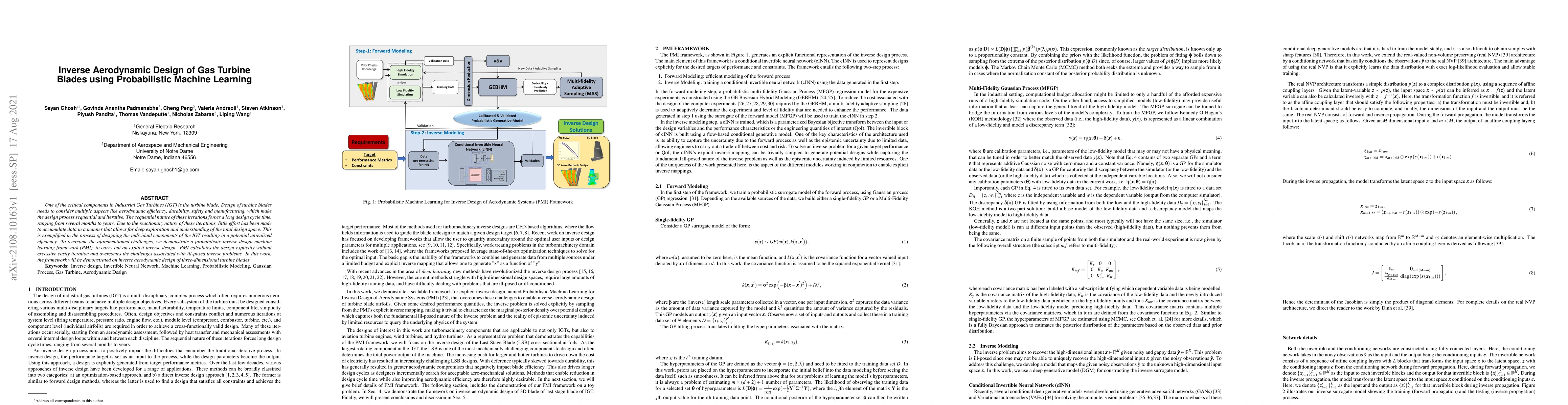 One of the critical components in Industrial Gas Turbines (IGT) is the turbine blade. Design of turbine blades needs to consider multiple aspects like aerodynamic efficiency, durability, safety and manufacturing, which make the design process sequential and iterative.The sequential nature of these iterations forces a long design cycle time, ranging from several months to years. Due to the reactionary nature of these iterations, little effort has been made to accumulate data in a manner that allows for deep exploration and understanding of the total design space. This is exemplified in the process of designing the individual components of the IGT resulting in a potential unrealized efficiency. To overcome the aforementioned challenges, we demonstrate a probabilistic inverse design machine learning framework (PMI), to carry out an explicit inverse design. PMI calculates the design explicitly without excessive costly iteration and overcomes the challenges associated with ill-posed inverse problems. In this work, the framework will be demonstrated on inverse aerodynamic design of three-dimensional turbine blades.