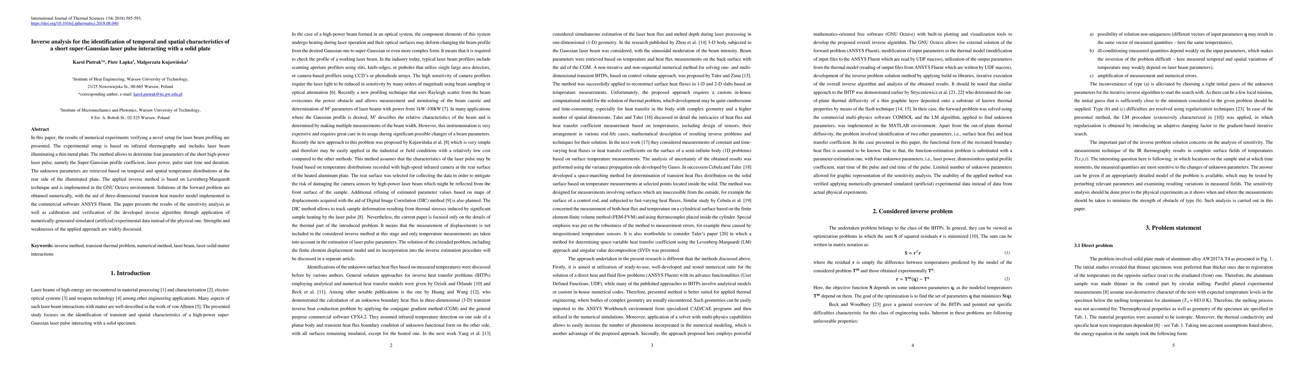 The study employs an inverse heat transfer approach to determine the spatio-temporal characteristics of high-power laser pulses interacting with an aluminum plate. Temperature data is collected from the rear surface of a thin metal sample using a fast infrared camera, and the forward problem is solved using ANSYS Fluent with UDF macros while the inverse analysis is conducted in GNU Octave using the Levenberg-Marquardt algorithm.