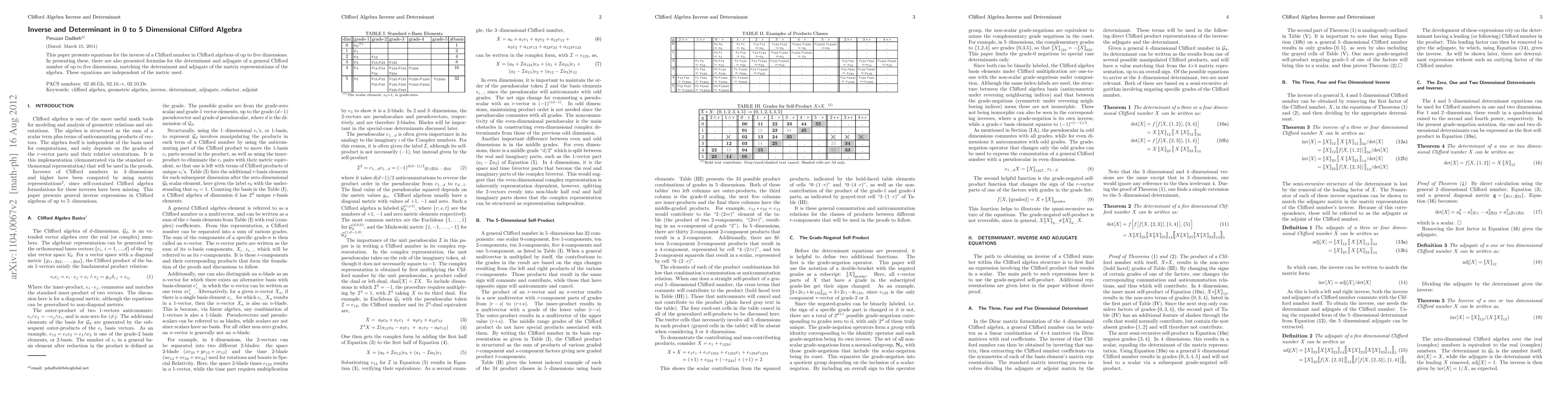 This paper derives equations for the inverse of Clifford numbers in dimensions 0 to 5, alongside formulas for their determinant and adjugate, which align with the matrix representations of the algebra and are metric-independent.