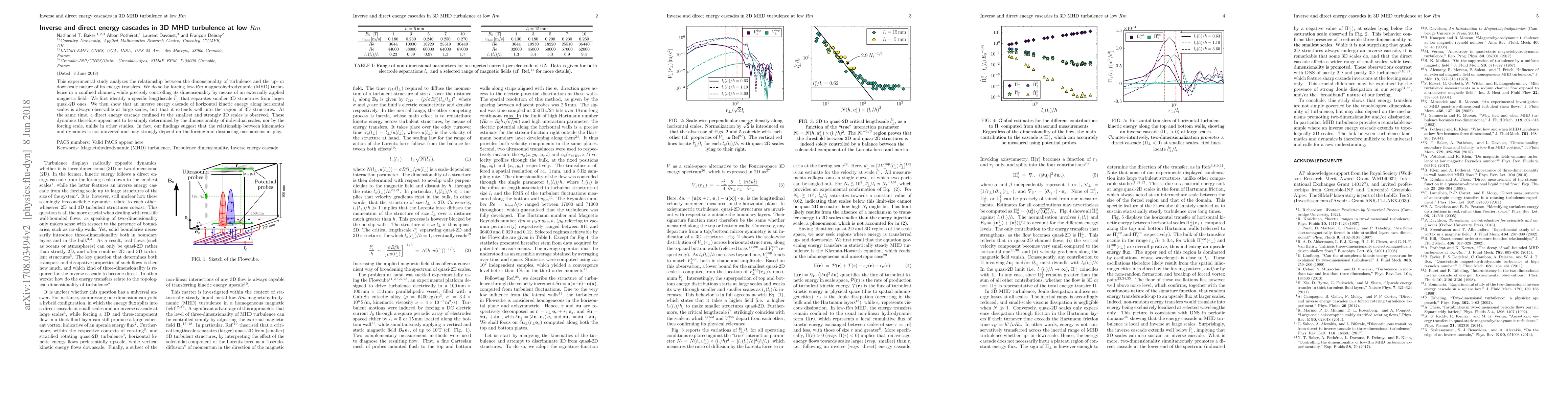 This experimental study analyzes the relationship between the dimensionality of turbulence and the upscale or downscale nature of its energy transfers. We do so by forcing low-$Rm$ magnetohydrodynamic (MHD) turbulence in a confined channel, while precisely controlling its dimensionality by means of an externally applied magnetic field. We first identify a specific lengthscale $\hat{l}_\perp^c$ that separates smaller three-dimensional structures from larger quasi-two-dimensional ones. We then show that an inverse energy cascade of horizontal kinetic energy along horizontal scales is always observable at large scales, but that it extends well into the region of 3D structures. At the same time, a direct energy cascade confined to the smallest and strongly 3D scales is observed. These dynamics therefore appear not to be simply determined by the dimensionality of individual scales, nor by the forcing scale, unlike in other studies. In fact, our findings suggest that the relationship between kinematics and dynamics is not universal and may strongly depend on the forcing and dissipating mechanisms at play.