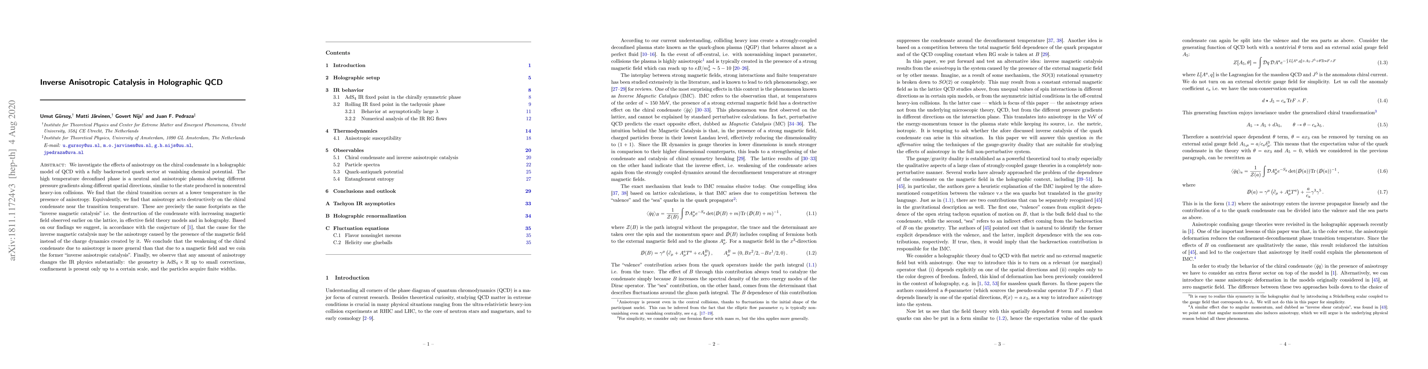 We investigate the effects of anisotropy on the chiral condensate in a holographic model of QCD with a fully backreacted quark sector at vanishing chemical potential. The high temperature deconfined phase is a neutral and anisotropic plasma showing different pressure gradients along different spatial directions, similar to the state produced in noncentral heavy-ion collisions. We find that the chiral transition occurs at a lower temperature in the presence of anisotropy. Equivalently, we find that anisotropy acts destructively on the chiral condensate near the transition temperature. These are precisely the same footprints as the "inverse magnetic catalysis" i.e. the destruction of the condensate with increasing magnetic field observed earlier on the lattice, in effective field theory models and in holography. Based on our findings we suggest, in accordance with the conjecture of [1], that the cause for the inverse magnetic catalysis may be the anisotropy caused by the presence of the magnetic field instead of the charge dynamics created by it. We conclude that the weakening of the chiral condensate due to anisotropy is more general than that due to a magnetic field and we coin the former "inverse anisotropic catalysis". Finally, we observe that any amount of anisotropy changes the IR physics substantially: the geometry is $\text{AdS}_4 \times \mathbb{R}$ up to small corrections, confinement is present only up to a certain scale, and the particles acquire finite widths.