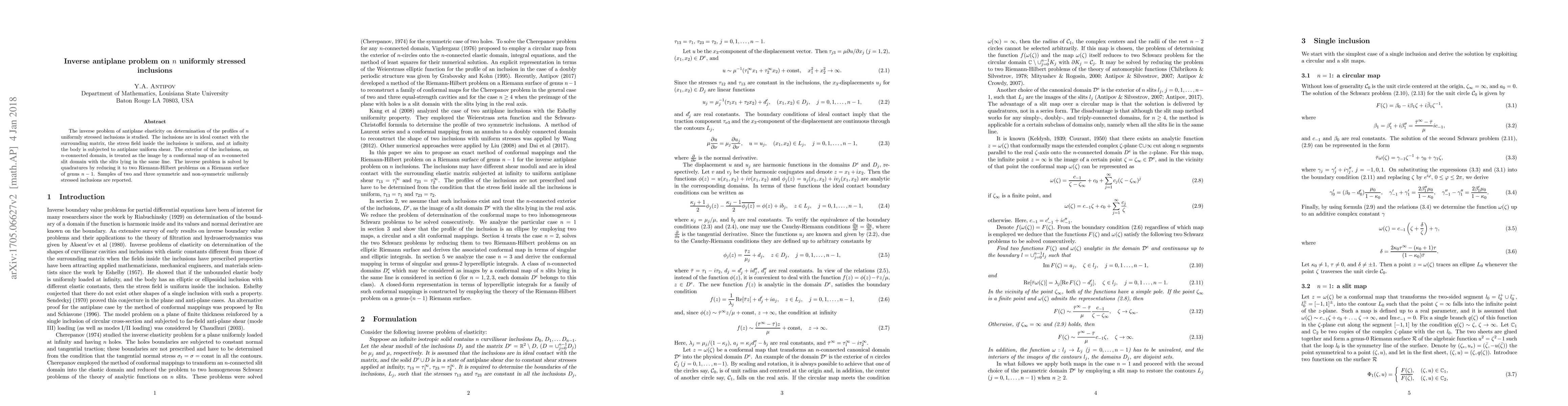 This paper addresses the inverse antiplane elasticity problem to determine the profiles of $n$ uniformly stressed inclusions in contact with a matrix, solving it via conformal mapping and Riemann-Hilbert problems. Results include sample configurations for two and three inclusions.