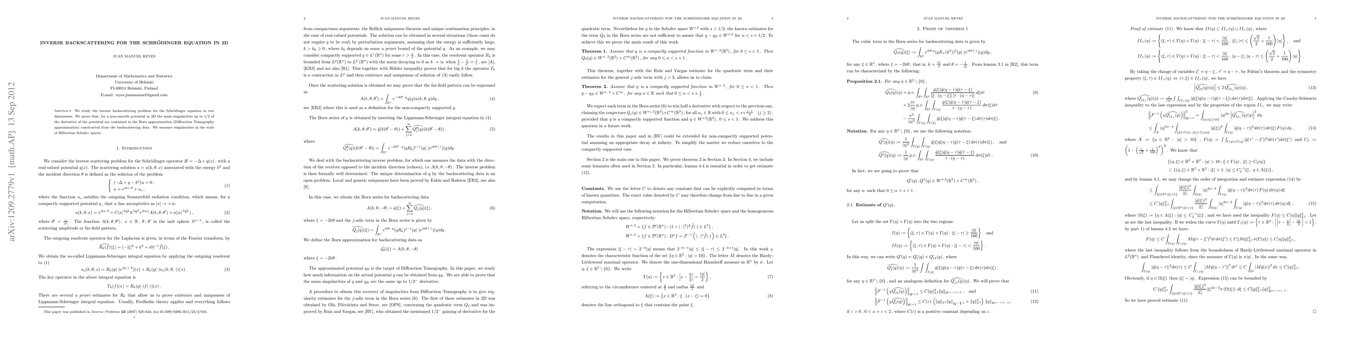 This paper investigates the inverse backscattering problem for the 2D Schrödinger equation, proving that the main singularities of the potential's derivative up to 1/2 can be reconstructed using the Born approximation from backscattering data, measured in the context of Hilbertian Sobolev spaces.