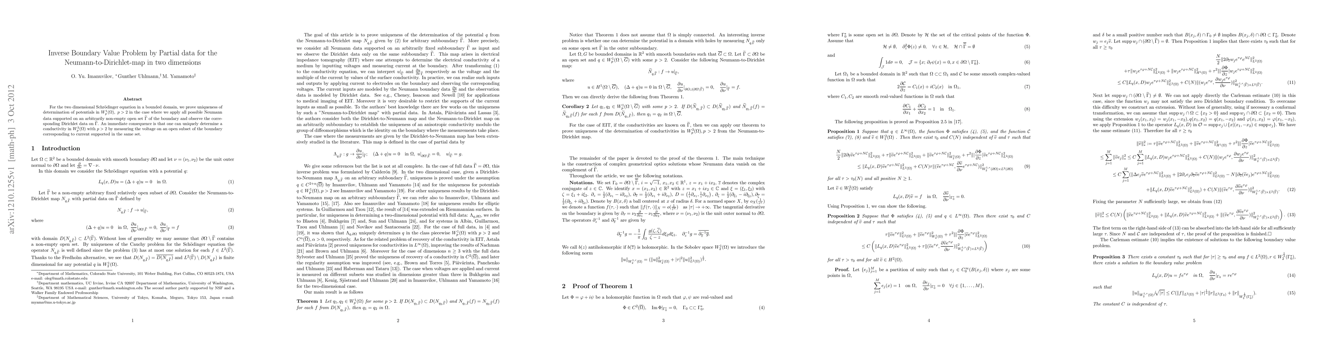 For the two dimensional Schr\"odinger equation in a bounded domain, we prove uniqueness of determination of potentials in $W^1_p(\Omega),\,\, p>2$ in the case where we apply all possible Neumann data supported on an arbitrarily non-empty open set $\widetilde\Gamma$ of the boundary and observe the corresponding Dirichlet data on $\widetilde{\Gamma}$. An immediate consequence is that one can uniquely determine a conductivity in $W^3_p(\Omega)$ with $p>2$ by measuring the voltage on an open subset of the boundary corresponding to current supported in the same set.