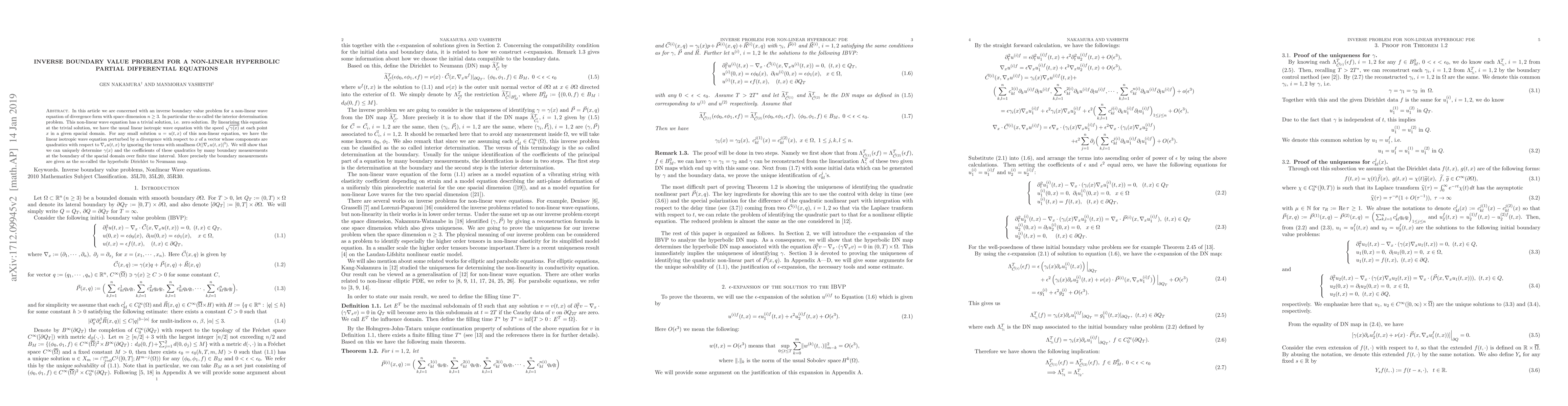 The paper presents a detailed mathematical formulation and proof of unique determination for a linearized non-linear hyperbolic PDE, employing advanced techniques in partial differential equations and functional analysis.