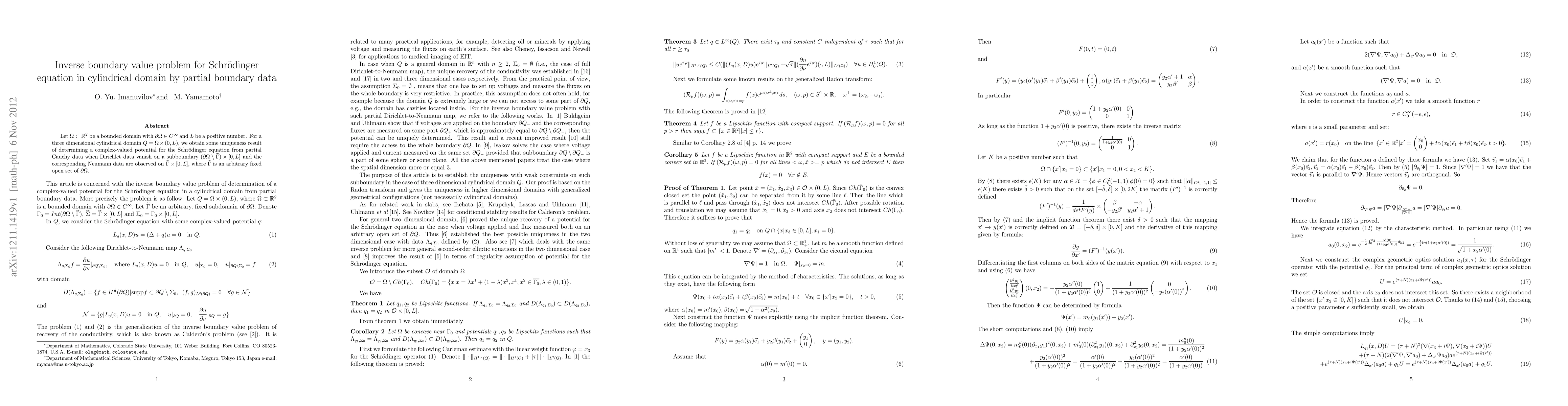 Researchers proved that unique complex-valued potential can be determined for the Schr"odinger equation in a cylindrical domain from partial Cauchy data with Dirichlet data on one subboundary and Neumann data on another.