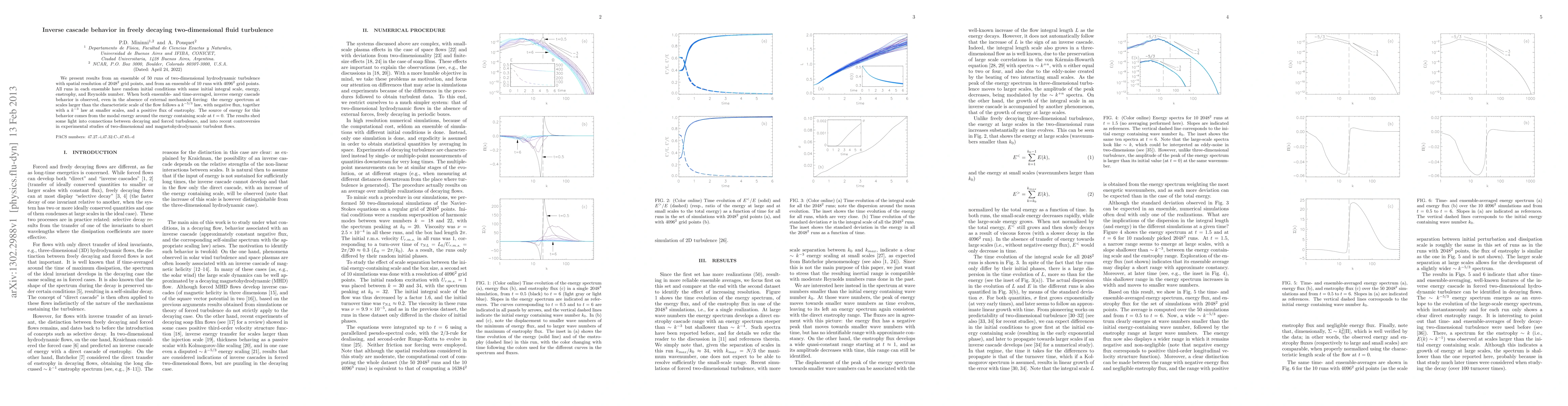 This paper investigates inverse cascade behavior in freely decaying two-dimensional fluid turbulence, observing an inverse energy cascade despite the absence of external forcing. The study reveals a k^(-5/3) energy spectrum law with negative flux at larger scales and a k^(-3) law at smaller scales, providing insights into the connections between decaying and forced turbulence.