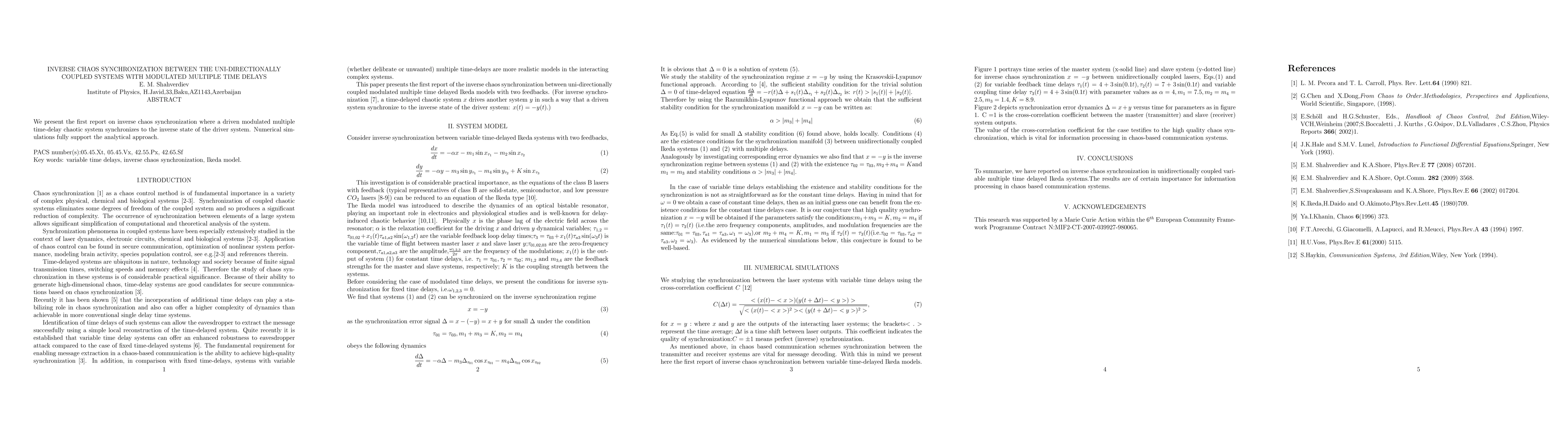 This paper reports on inverse chaos synchronization in uni-directionally coupled systems with modulated multiple time delays, demonstrating that a driven system can synchronize to the inverse state of the driver, supported by both analytical and numerical simulations.