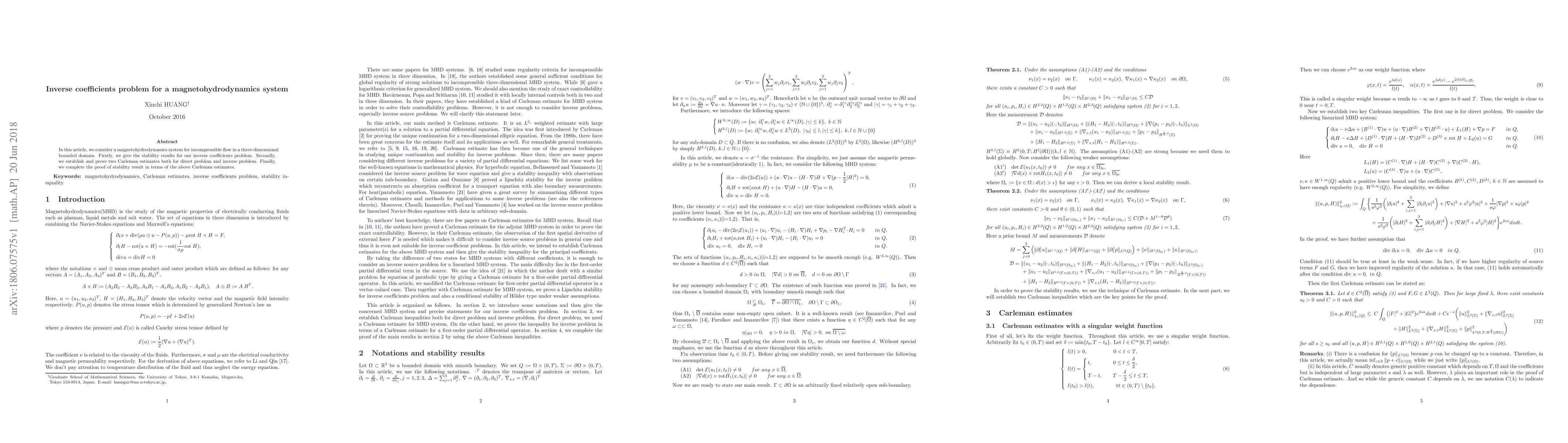 This paper investigates the inverse coefficients problem for a magnetohydrodynamics system governing incompressible flow in a three-dimensional domain. It establishes stability results and proves two Carleman estimates for both direct and inverse problems, ultimately confirming the stability through these estimates.
