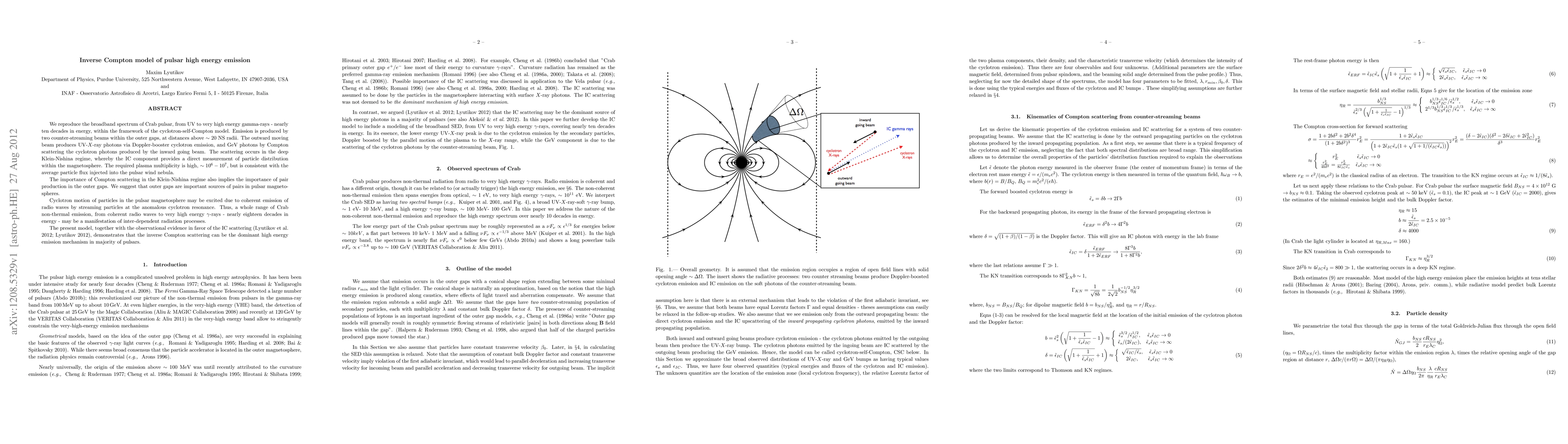 We reproduce the broadband spectrum of Crab pulsar, from UV to very high energy gamma-rays - nearly ten decades in energy, within the framework of the cyclotron-self-Compton model. Emission is produced by two counter-streaming beams within the outer gaps, at distances above $\sim$ 20 NS radii. The outward moving beam produces UV-$X$-ray photons via Doppler-booster cyclotron emission, and GeV photons by Compton scattering the cyclotron photons produced by the inward going beam. The scattering occurs in the deep Klein-Nishina regime, whereby the IC component provides a direct measurement of particle distribution within the magnetosphere. The required plasma multiplicity is high, $\sim 10^6-10^7$, but is consistent with the average particle flux injected into the pulsar wind nebula. The importance of Compton scattering in the Klein-Nishina regime also implies the importance of pair production in the outer gaps. We suggest that outer gaps are important sources of pairs in pulsar magnetospheres. Cyclotron motion of particles in the pulsar magnetosphere may be excited due to coherent emission of radio waves by streaming particles at the anomalous cyclotron resonance. Thus, a whole range of Crab non-thermal emission, from coherent radio waves to very high energy $\gamma$-rays - nearly eighteen decades in energy - may be a manifestation of inter-dependent radiation processes. The present model, together with the observational evidence in favor of the IC scattering (Lyutikov et al. 2012; Lyutikov 2012), demonstrates that the inverse Compton scattering can be the dominant high energy emission mechanism in majority of pulsars.