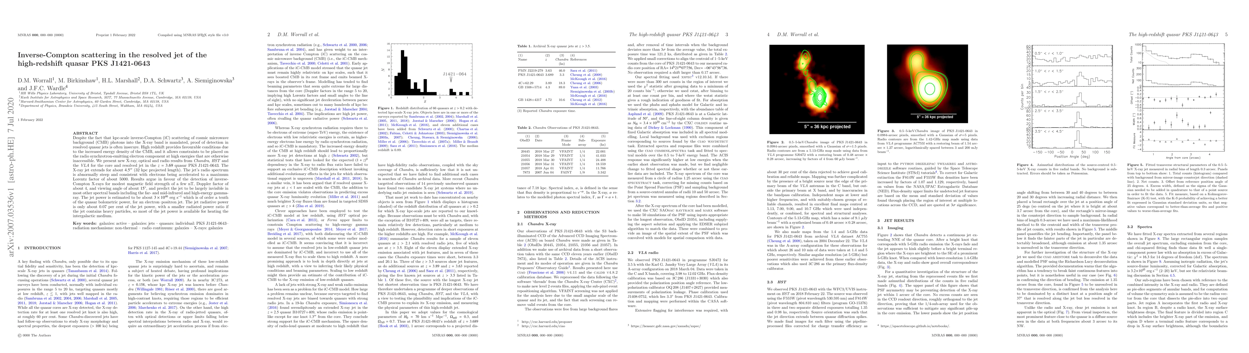 New X-ray, optical, and radio observations of the high-redshift quasar PKS J1421-0643 reveal a 32 kpc extended jet, confirming inverse-Compton scattering of CMB photons into X-rays. The jet's steep radio spectrum suggests high-energy electron acceleration to Lorentz factors of ~5000. The findings imply modest magnetic fields, moderate Doppler factors, and a viewing angle of ~15°, predicting low jet visibility in other bands. The jet power, a tenth of the quasar's bolometric power, indicates most energy is available for intergalactic medium heating, not radiation.