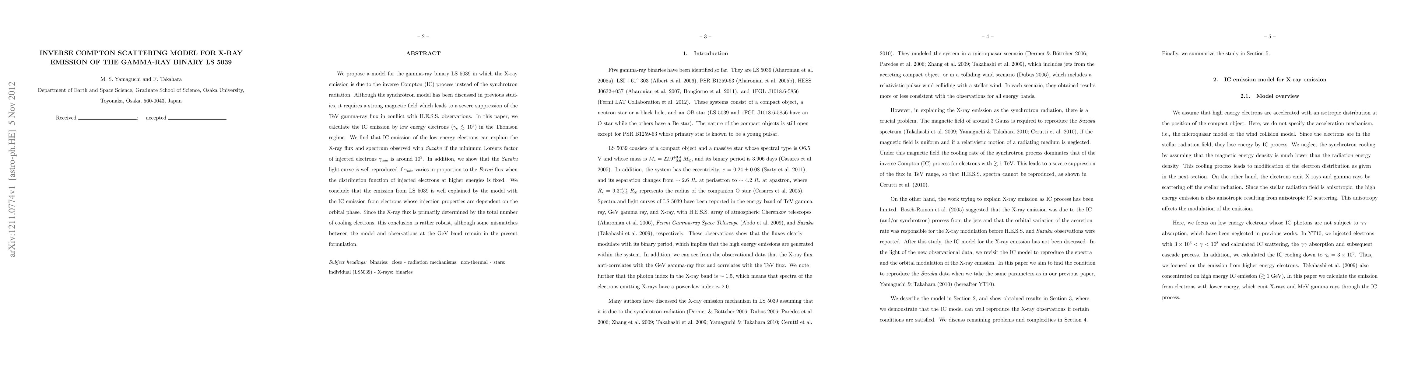 This research proposes an Inverse Compton Scattering (IC) model for X-ray emission in the gamma-ray binary LS 5039, contrasting the previous synchrotron radiation model. The IC model, using low-energy electrons, explains observed X-ray flux and spectrum by Suzaku, with electron minimum Lorentz factor (gamma_min) around 10^3. Variations in gamma_min linked to Fermi flux also reproduce the Suzaku light curve. The study concludes that LS 5039's emission is better explained by this IC model, despite some GeV band discrepancies.