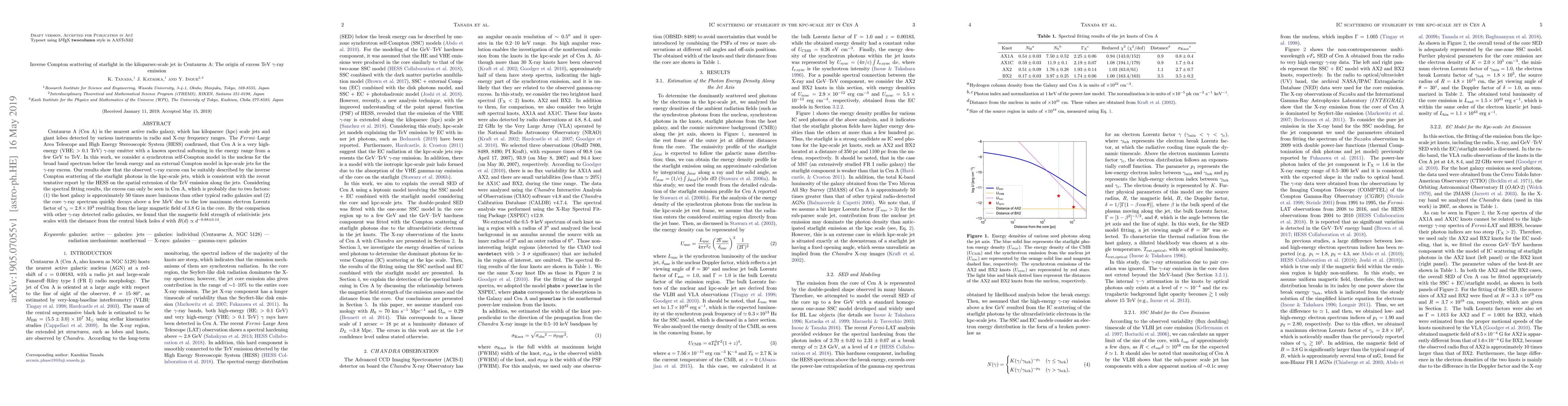 Centaurus A (Cen~A) is the nearest active radio galaxy, which has kiloparsec (kpc) scale jets and {giant lobes detected by various instruments in radio and X-ray frequency ranges}. The $Fermi$--Large Area Telescope and High Energy Stereoscopic System (HESS) confirmed, that Cen~A is a very high-energy (VHE; $> 0.1$~TeV) $\gamma$-ray emitter with a known spectral {softening} in the energy range from a few GeV to TeV. In this work, we consider a synchrotron self-Compton model in the nucleus for the broad band spectrum {below the break energy} and an external Compton model in kpc-scale jets for the $\gamma$-ray excess. Our results show that the observed $\gamma$-ray excess can be suitably described by the inverse Compton scattering of the starlight photons in the kpc-scale jets, which is consistent with the recent tentative report by the HESS on the spatial extension of the TeV emission along the jets. Considering the spectral fitting results, the excess can only be seen in Cen~A, which is probably due to two factors: (1) the host galaxy is approximately 50 times more luminous than other typical radio galaxies and (2) the core $\gamma$-ray spectrum quickly decays above a few MeV due to the low maximum electron Lorentz factor of $\gamma_{\rm c}=2.8 \times 10^3$ resulting from the large magnetic field of 3.8~G in the core. By the comparison with other $\gamma$-ray detected radio galaxies, we found that the magnetic field strength of relativistic jets scales with the distance from the central black holes $d$ with $B (d) \propto d^{-0.88 \pm 0.14}$.