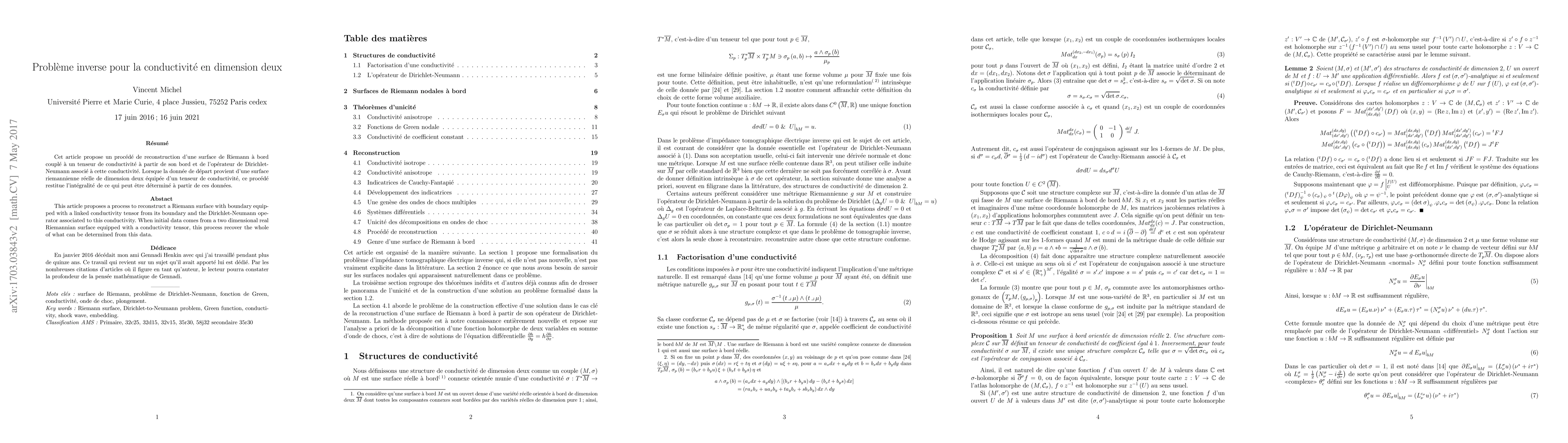 This article proposes a process to reconstruct a Riemann surface with boundary equipped with a conductivity tensor from its boundary and its Dirichlet-Neumann operator. When initial data comes from a two dimensional real Riemannian oriented surface equipped with a conductivity tensor, this process recover the whole of what can be determined from this data.