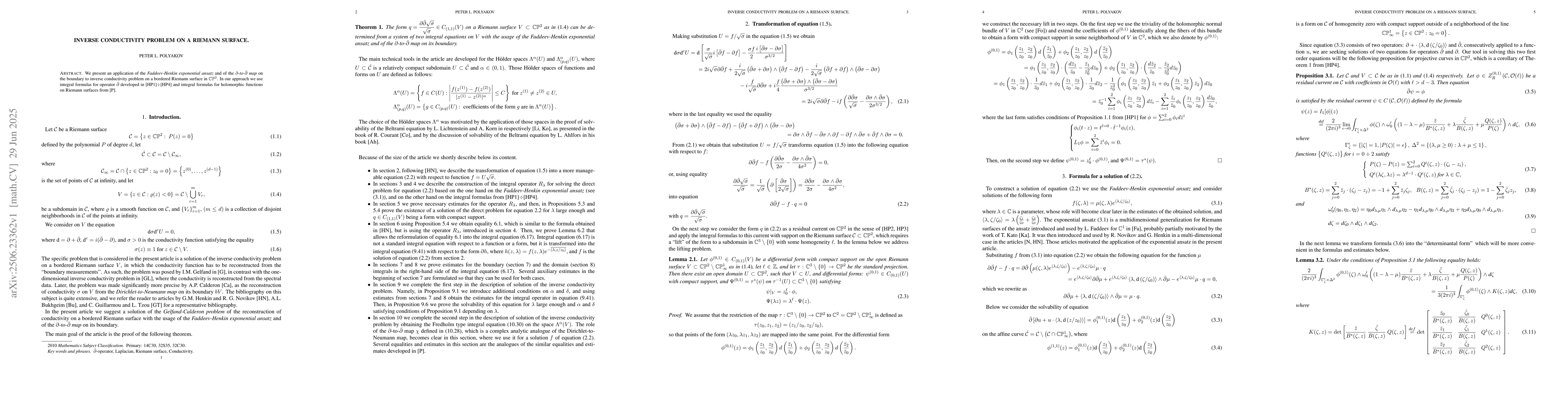 We present an application of the Faddeev-Henkin exponential ansatz and of the d-to-d-bar map on the boundary to inverse conductivity problem on a bordered Riemann surface in CP2. In our approach we use integral formulas for operator d-bar developed in [HP1]-[HP4] and integral formulas for holomorphic functions on Riemann surfaces from [P].
