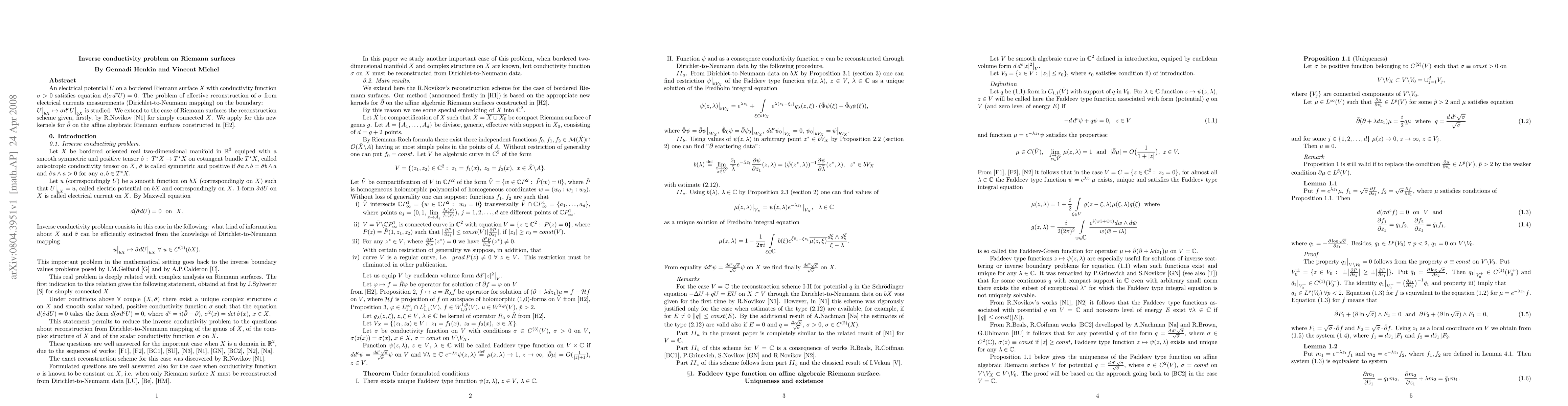 An electrical potential U on a bordered Riemann surface X with conductivity function sigma>0 satisfies equation d(sigma d^cU)=0. The problem of effective reconstruction of sigma is studied. We extend to the case of Riemann surfaces the reconstruction scheme given, firstly, by R.Novikov (1988) for simply connected X. We apply for this new kernels for dbar on affine algebraic Riemann surfaces constructed in Henkin, arXiv:0804.3761