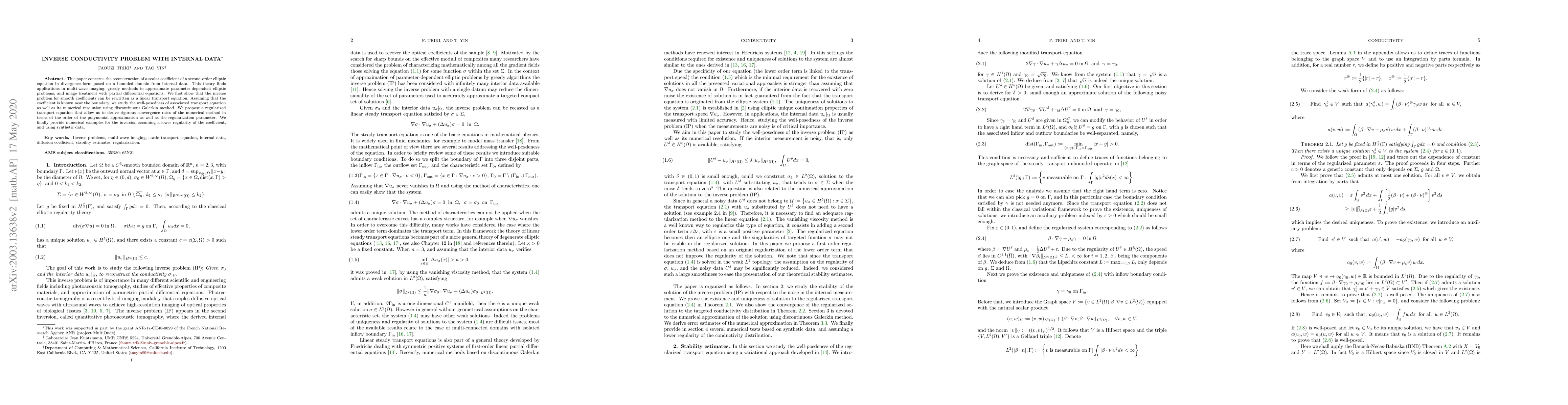 This paper concerns the reconstruction of a scalar coefficient of a second-order elliptic equation in divergence form posed on a bounded domain from internal data. This theory finds applications in multi-wave imaging, greedy methods to approximate parameter-dependent elliptic problems, and image treatment with partial differential equations. We first show that the inverse problem for smooth coefficients can be rewritten as a linear transport equation. Assuming that the coefficient is known near the boundary, we study the well-posedness of associated transport equation as well as its numerical resolution using discontinuous Galerkin method. We propose a regularized transport equation that allow us to derive rigorous convergence rates of the numerical method in terms of the order of the polynomial approximation as well as the regularization parameter. We finally provide numerical examples for the inversion assuming a lower regularity of the coefficient, and using synthetic data.