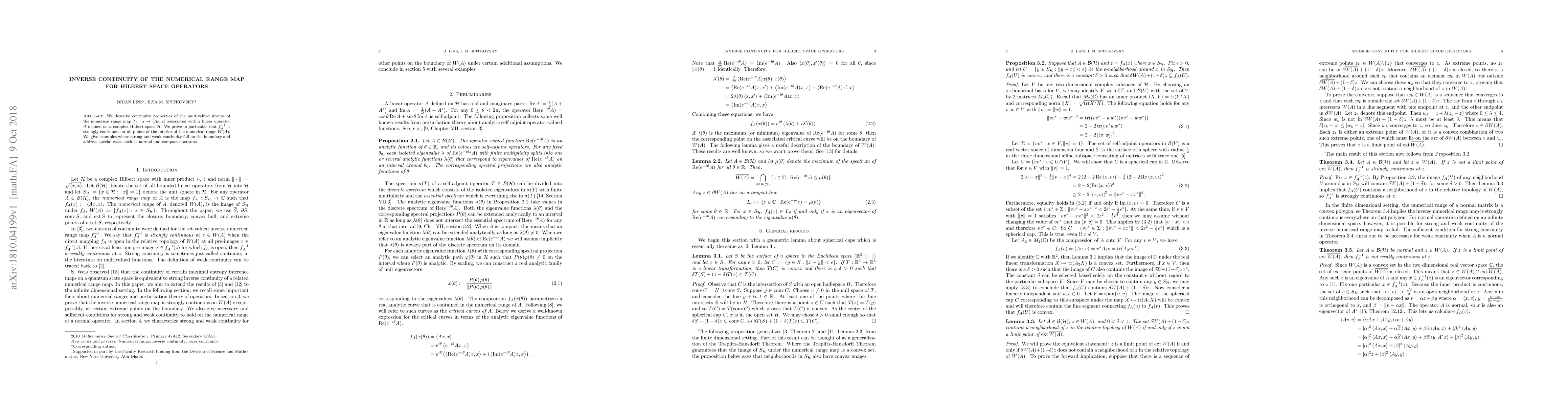 This paper investigates the continuity properties of the inverse of the numerical range map for Hilbert space operators, proving strong continuity within the interior of the numerical range. It also examines cases where continuity fails on the boundary and discusses special cases like normal and compact operators.