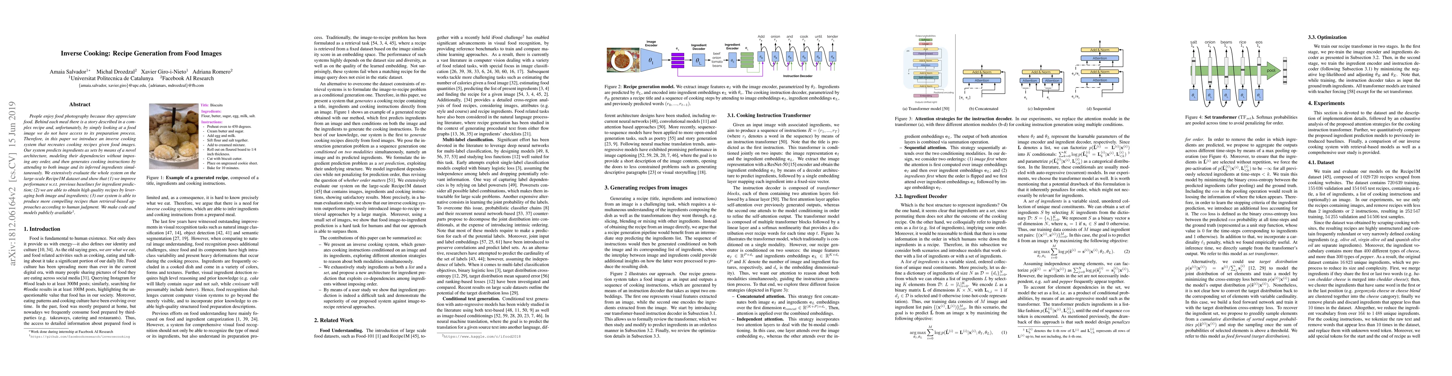People enjoy food photography because they appreciate food. Behind each meal there is a story described in a complex recipe and, unfortunately, by simply looking at a food image we do not have access to its preparation process. Therefore, in this paper we introduce an inverse cooking system that recreates cooking recipes given food images. Our system predicts ingredients as sets by means of a novel architecture, modeling their dependencies without imposing any order, and then generates cooking instructions by attending to both image and its inferred ingredients simultaneously. We extensively evaluate the whole system on the large-scale Recipe1M dataset and show that (1) we improve performance w.r.t. previous baselines for ingredient prediction; (2) we are able to obtain high quality recipes by leveraging both image and ingredients; (3) our system is able to produce more compelling recipes than retrieval-based approaches according to human judgment. We make code and models publicly available.