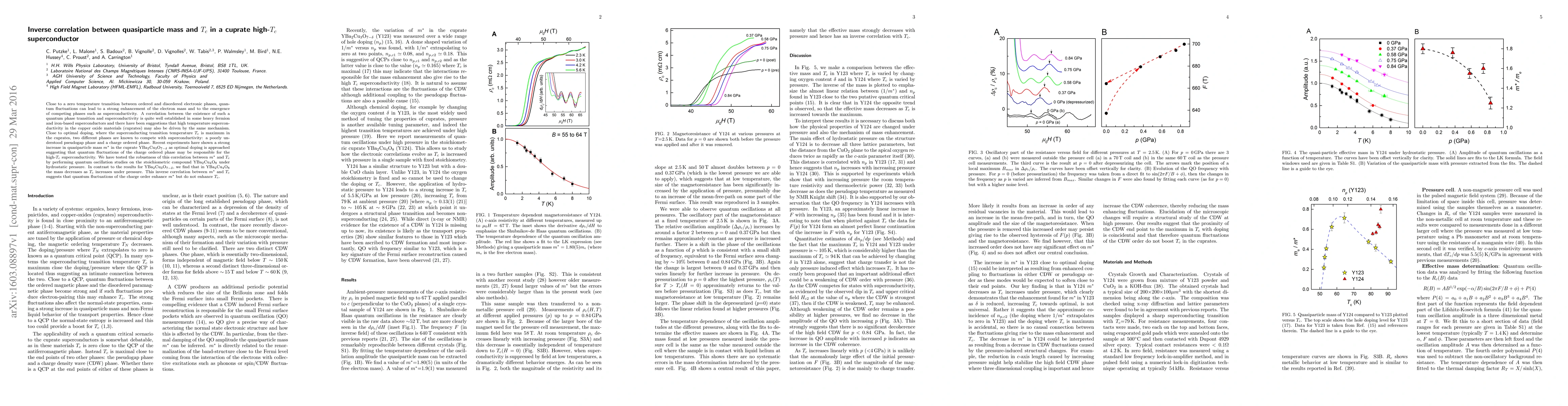 This study investigates the relationship between quasiparticle mass $m^*$ and superconducting transition temperature $T_c$ in cuprate superconductors, revealing an inverse correlation in YBa$_2$Cu$_4$O$_8$ under pressure, contrasting with the expected direct correlation in YBa$_2$Cu$_3$O$_{7-\delta}$. This suggests that while quantum fluctuations of charge order enhance $m^*$, they do not boost $T_c$.