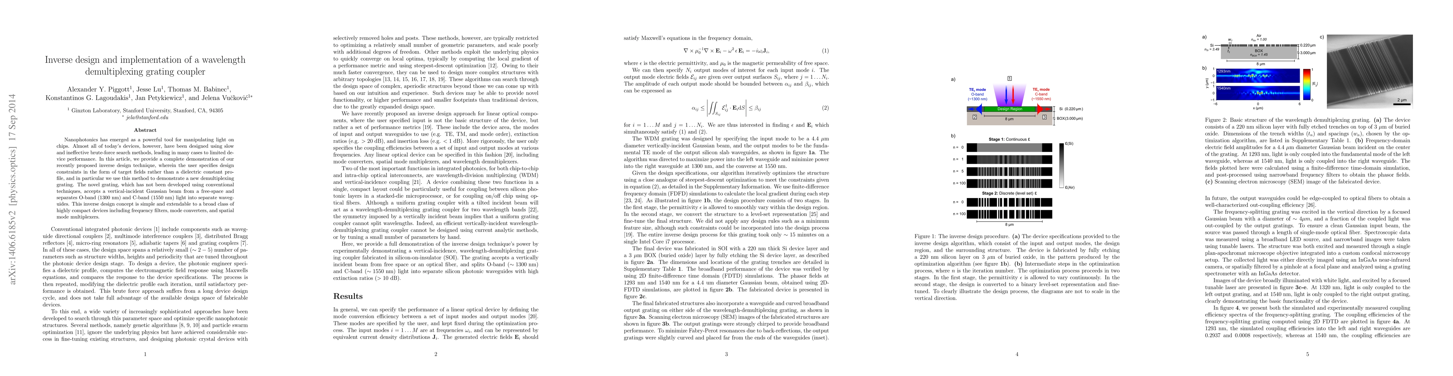 Nanophotonics has emerged as a powerful tool for manipulating light on chips. Almost all of today's devices, however, have been designed using slow and ineffective brute-force search methods, leading in many cases to limited device performance. In this article, we provide a complete demonstration of our recently proposed inverse design technique, wherein the user specifies design constraints in the form of target fields rather than a dielectric constant profile, and in particular we use this method to demonstrate a new demultiplexing grating. The novel grating, which has not been developed using conventional techniques, accepts a vertical-incident Gaussian beam from a free-space and separates O-band $(1300\mathrm{nm})$ and C-band $(1550\mathrm{nm})$ light into separate waveguides. This inverse design concept is simple and extendable to a broad class of highly compact devices including frequency splitters, mode converters, and spatial mode multiplexers.