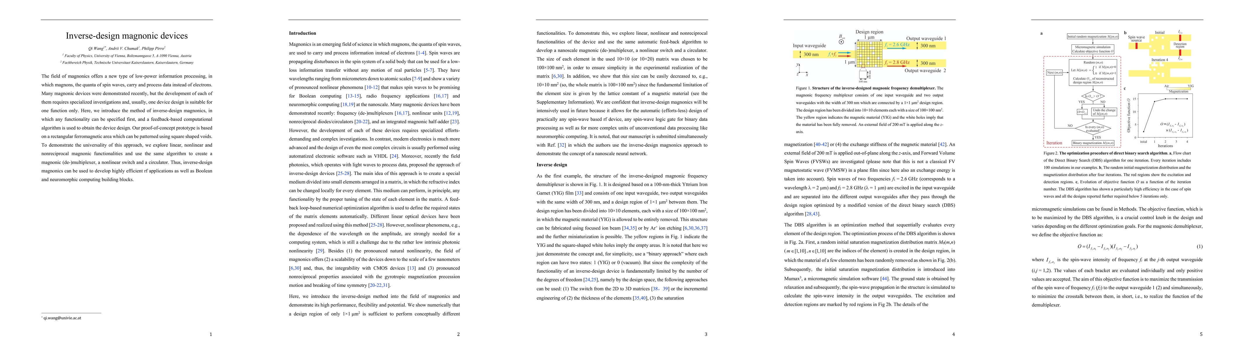 This paper introduces inverse-design magnonics, a method to specify desired functionalities first, then use a computational algorithm to design devices, demonstrating its versatility with magnonic multiplexers, switches, and circulators. The approach promises efficient low-power rf applications and computing components.