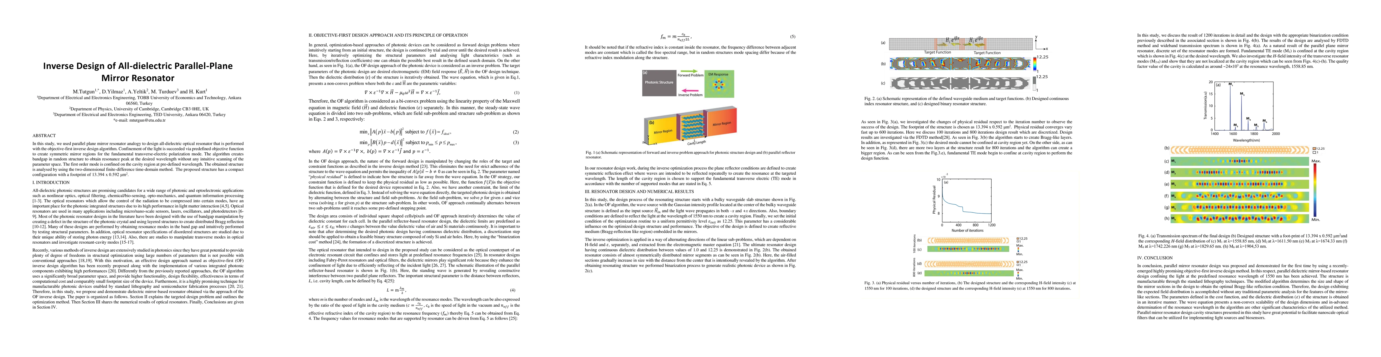 In this study, we used parallel plane mirror resonator analogy to design all-dielectric optical resonator that is performed with the objective-first inverse design algorithm. Confinement of the light is succeeded via predefined objective function to create symmetric mirror regions for the fundamental transverse-electric polarization mode. The algorithm creates bandgap in random structure to obtain resonance peak at the desired wavelength without any intuitive scanning of the parameter space. The first order mode is confined on the cavity region at pre-defined wavelength. The obtained structure is analysed by using the two-dimensional finite-difference time-domain method. The proposed structure has a compact configuration with a footprint of $13.394 \times 0.592 \mu m^2$.
