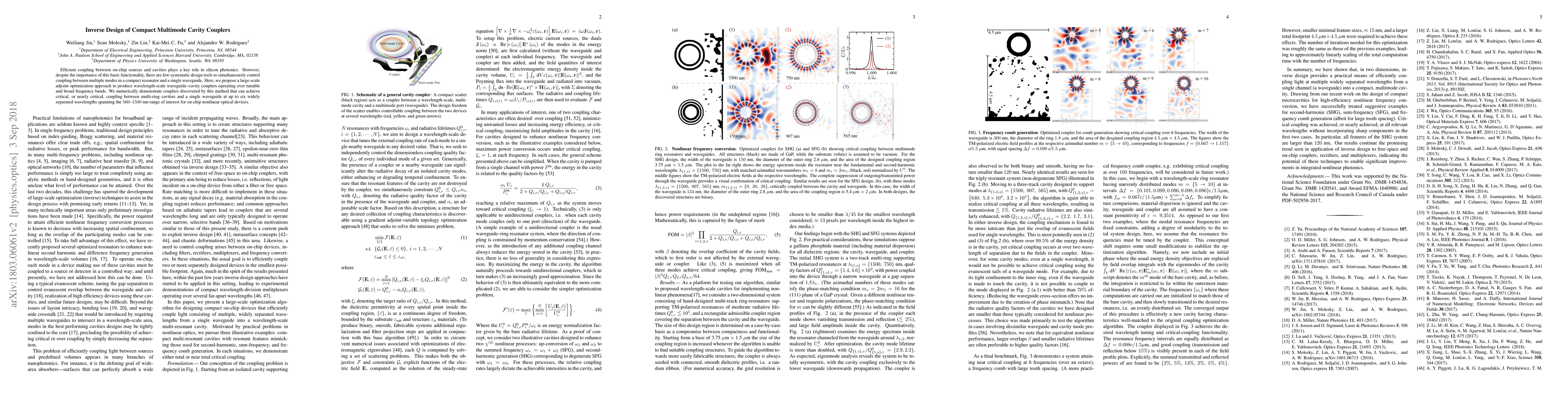 Efficient coupling between on-chip sources and cavities plays a key role in silicon photonics. However, despite the importance of this basic functionality, there are few systematic design tools to simultaneously control coupling between multiple modes in a compact resonator and a single waveguide. Here, we propose a large-scale adjoint optimization approach to produce wavelength-scale waveguide--cavity couplers operating over tunable and broad frequency bands. We numerically demonstrate couplers discovered by this method that can achieve critical, or nearly critical, coupling between multi-ring cavities and a single waveguide at up to six widely separated wavelengths spanning the $560$--$1500$~nm range of interest for on-chip nonlinear optical devices.
