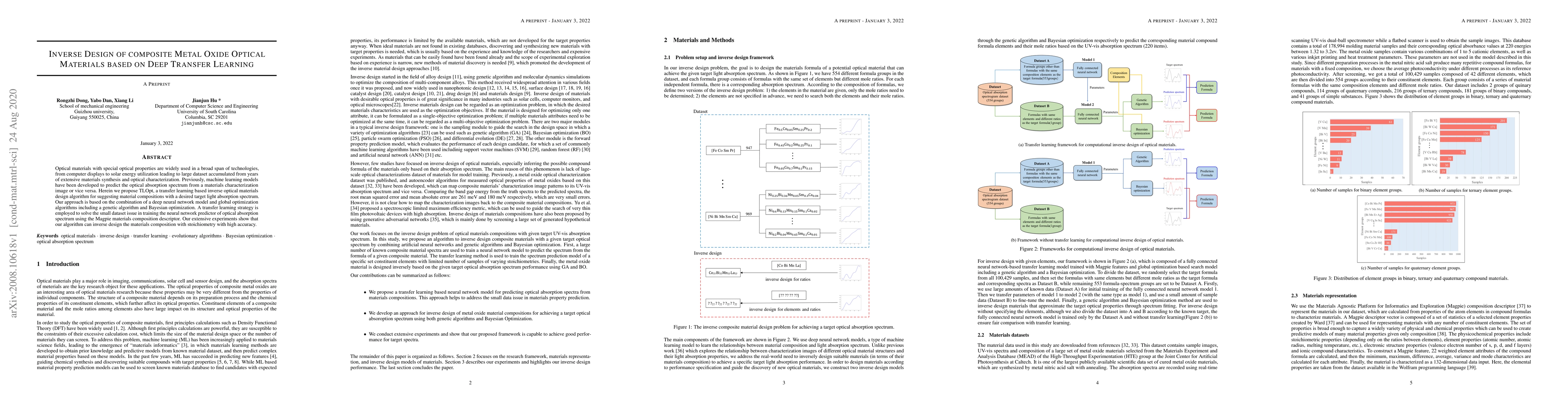 This paper proposes TLOpt, an inverse design algorithm for composite metal oxide optical materials, leveraging deep transfer learning to suggest material compositions that achieve a desired light absorption spectrum. The approach combines deep neural networks with global optimization and addresses small dataset issues through transfer learning, achieving high accuracy in material composition design.