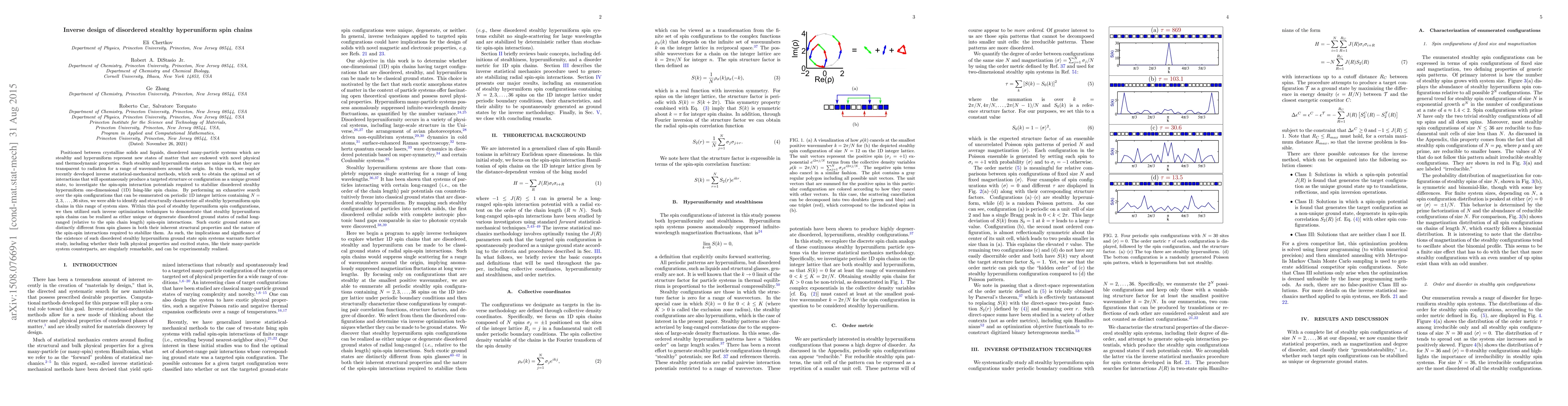 This paper explores the inverse design of disordered stealthy hyperuniform spin chains using statistical-mechanical methods to identify optimal spin-spin interactions. It reveals that these unique spin chains can emerge as distinct ground states, differing from spin glasses, and suggests further study into their physical properties and experimental realization.
