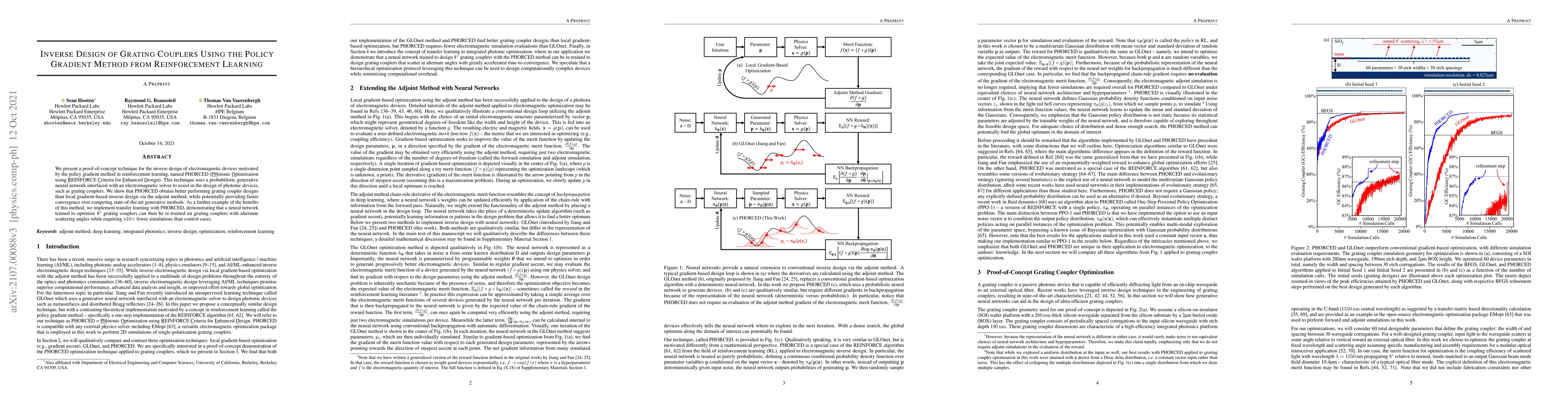 This paper introduces PHORCED, an inverse design technique for grating couplers based on reinforcement learning's policy gradient method, showing superior performance and faster convergence compared to traditional adjoint methods. It also demonstrates transfer learning efficiency, requiring significantly fewer simulations for new designs.