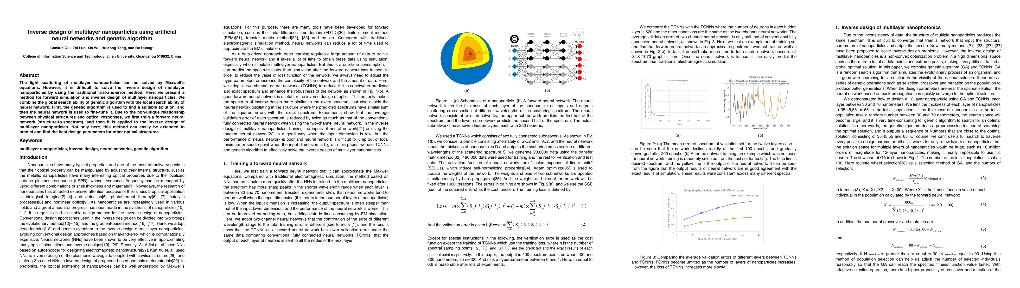 This paper proposes an innovative method combining genetic algorithms and neural networks for the inverse design of multilayer nanoparticles, addressing the challenge of light scattering through Maxwell's equations. The genetic algorithm identifies suitable initial designs, while the neural network refines them, enabling efficient and effective optimization of nanoparticle structures.