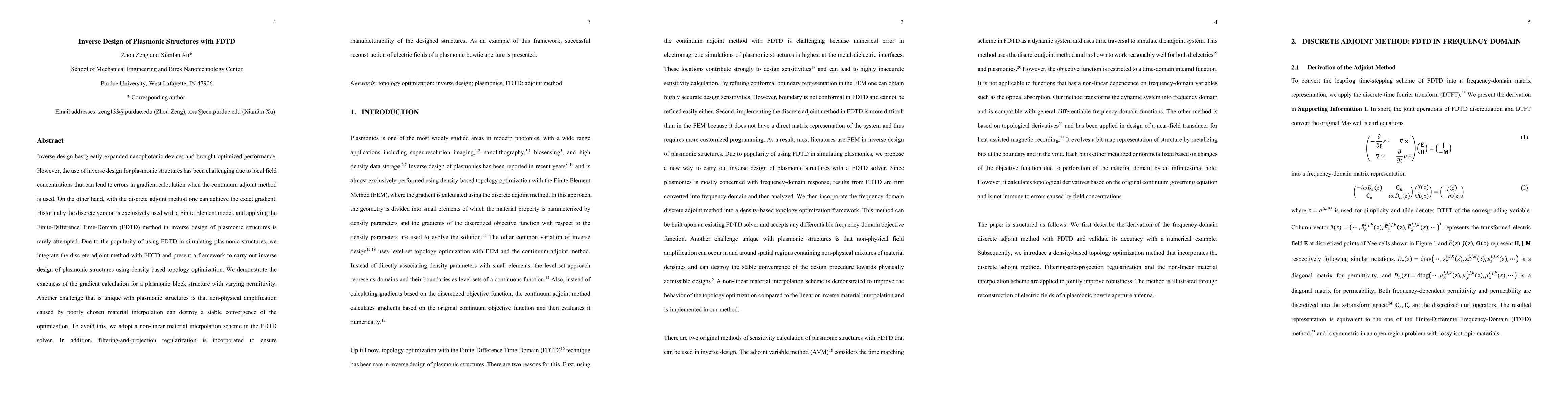 This paper presents a framework for inverse design of plasmonic structures using the Finite-Difference Time-Domain (FDTD) method combined with the discrete adjoint method for exact gradient calculation. It addresses challenges like non-physical amplification and ensures manufacturability through regularization and non-linear material interpolation, demonstrated by reconstructing electric fields of a plasmonic bowtie aperture.