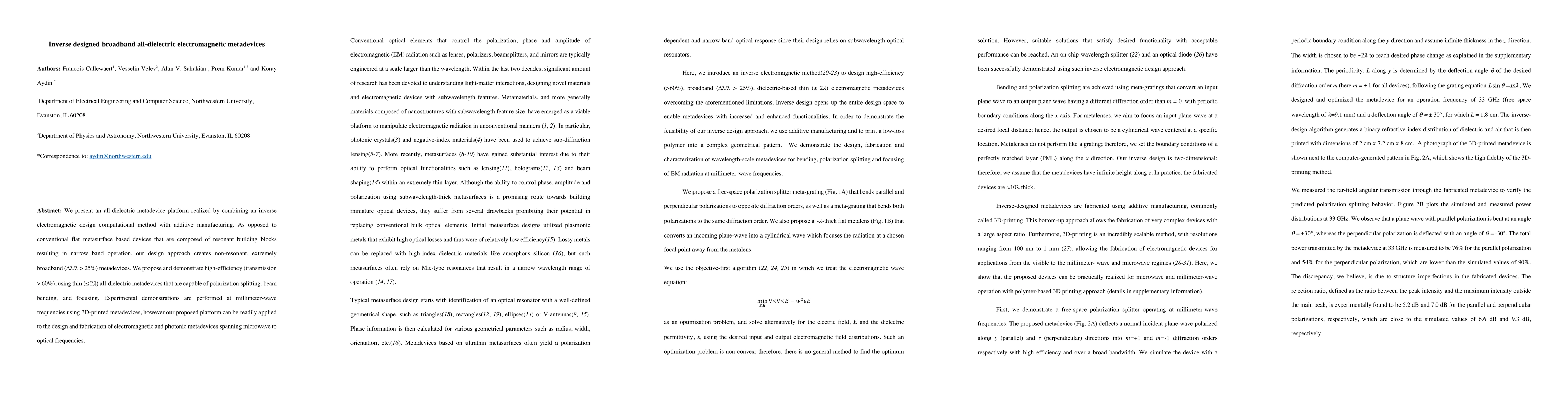 This paper introduces an inverse design method for creating broadband all-dielectric metadevices using additive manufacturing, achieving high efficiency and multifunctionality (polarization splitting, beam bending, focusing) across a wide frequency range from millimeter waves to optical frequencies. Experimental validation is performed at millimeter-wave frequencies with 3D-printed components.