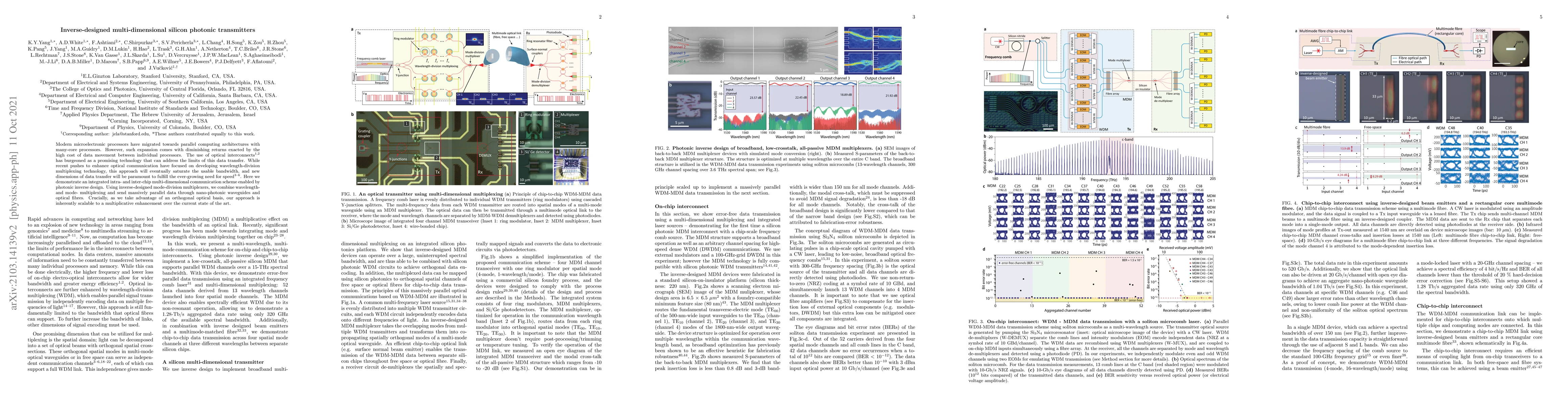 This paper presents an inverse-designed multi-dimensional silicon photonic transmitter system that combines wavelength- and mode-multiplexing to enhance data transfer in many-core processors. The method leverages orthogonal optical basis for scalability, promising significant improvements over current optical communication technologies.