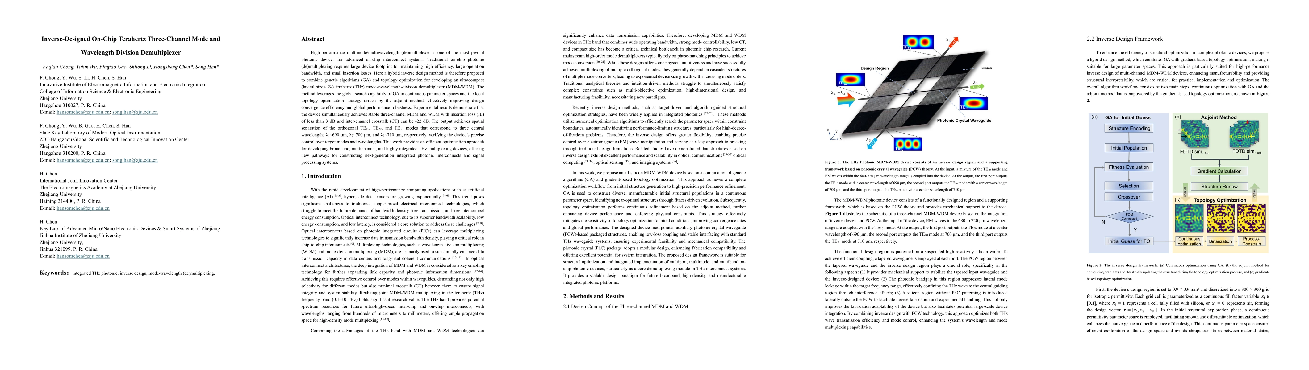 High-performance multimode/multiwavelength (de)multiplexer is one of the most pivotal photonic devices for advanced on-chip interconnect systems. Traditional on-chip photonic (de)multiplexing requires large device footprint for maintaining high efficiency, large operation bandwidth, and small insertion losses. Here a hybrid inverse design method is therefore proposed to combine genetic algorithms (GA) and topology optimization for developing an ultracompact (lateral size< 2{\lambda}) terahertz (THz) mode-/wavelength-division demultiplexer (MDM-WDM). The method leverages the global search capability of GA in continuous parameter spaces and the local topology optimization strategy driven by the adjoint method, effectively improving design convergence efficiency and global performance robustness. Experimental results demonstrate that the device simultaneously achieves stable three-channel MDM and WDM with insertion loss (IL) of less than 3 dB and inter-channel crosstalk (CT) can be -22 dB. The output achieves spatial separation of the orthogonal TE10, TE20, and TE30 modes that correspond to three central wavelengths {\lambda}1~690 {\mu}m, {\lambda}2~700 {\mu}m, and {\lambda}3~710 {\mu}m, respectively, verifying the device's precise control over target modes and wavelengths. This work provides an efficient optimization approach for developing broadband, multichannel, and highly integrated THz multiplexing devices, offering new pathways for constructing next-generation integrated photonic interconnects and signal processing systems.