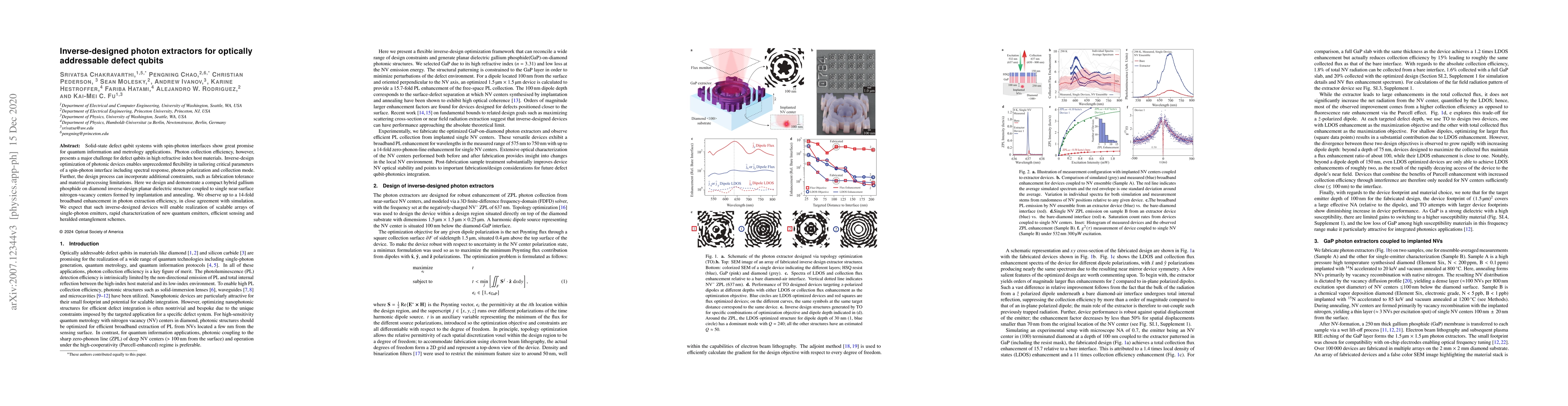 Solid-state defect qubit systems with spin-photon interfaces show great promise for quantum information and metrology applications. Photon collection efficiency, however, presents a major challenge for defect qubits in high refractive index host materials. Inverse-design optimization of photonic devices enables unprecedented flexibility in tailoring critical parameters of a spin-photon interface including spectral response, photon polarization and collection mode. Further, the design process can incorporate additional constraints, such as fabrication tolerance and material processing limitations. Here we design and demonstrate a compact hybrid gallium phosphide on diamond inverse-design planar dielectric structure coupled to single near-surface nitrogen-vacancy centers formed by implantation and annealing. We observe device operation near the theoretical limit and measure up to a 14-fold broadband enhancement in photon extraction efficiency. We expect that such inverse-designed devices will enable realization of scalable arrays of single-photon emitters, rapid characterization of new quantum emitters, sensing and efficient heralded entanglement schemes.