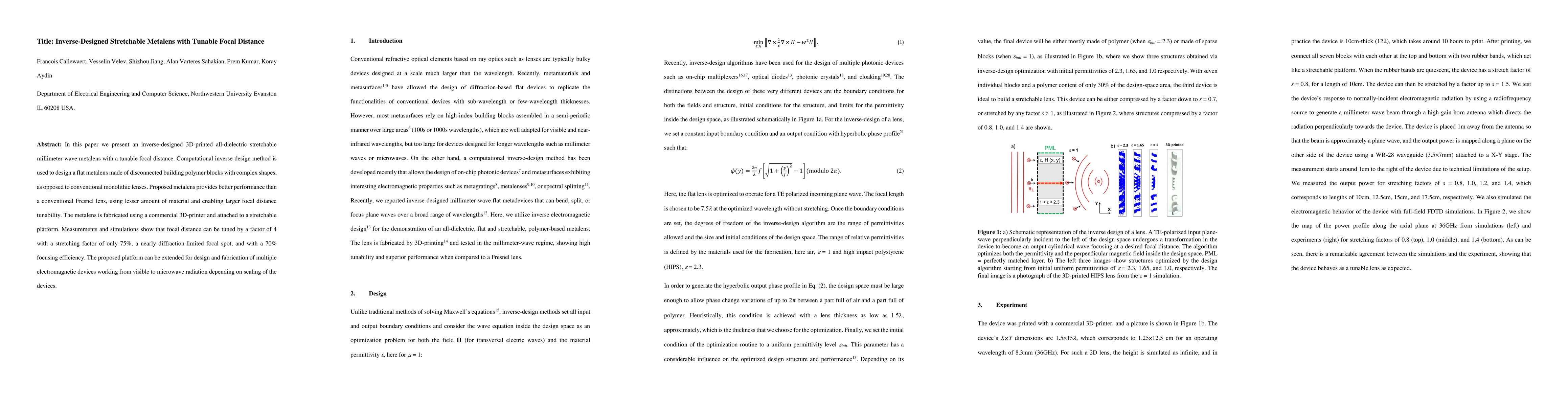 This paper introduces an inverse-designed, 3D-printed stretchable metalens made from polymer blocks, offering tunable focal distance and superior performance compared to conventional lenses. The metalens demonstrates a 4x focal distance tunability with 70% focusing efficiency, paving the way for versatile electromagnetic device design.