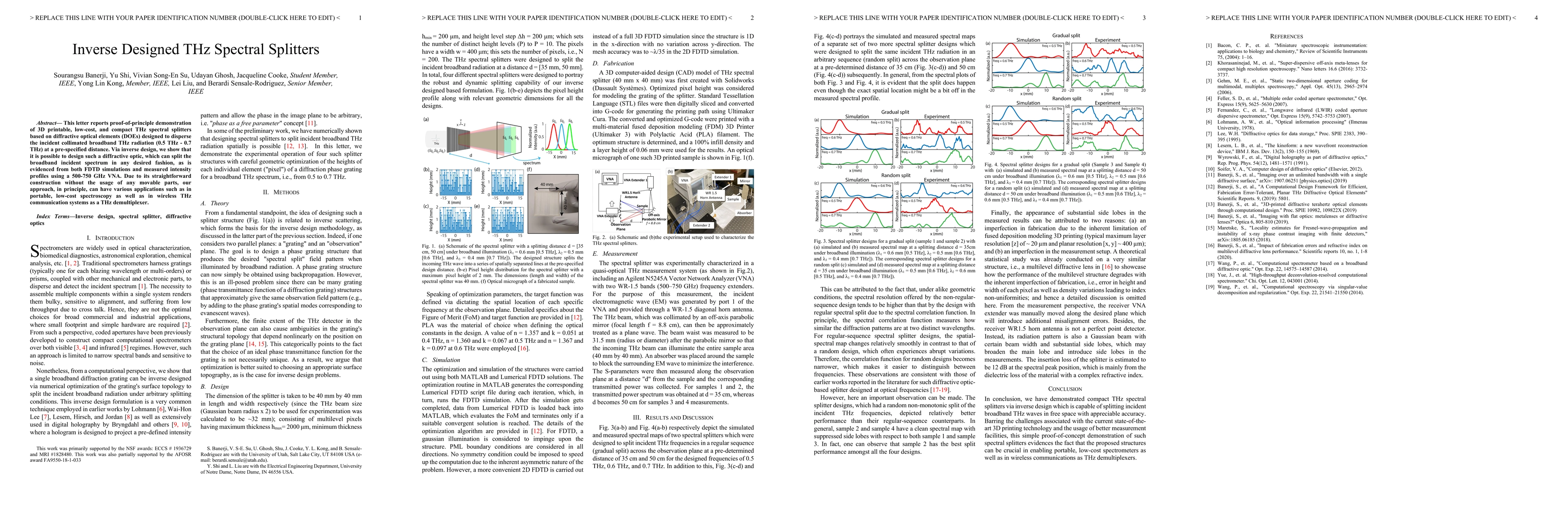 This paper demonstrates the inverse design of 3D printable, low-cost THz spectral splitters using diffractive optical elements, which can disperse broadband THz radiation efficiently. The proposed splitters are shown to work effectively through simulations and measurements, potentially enabling applications in portable spectroscopy and THz communication systems.