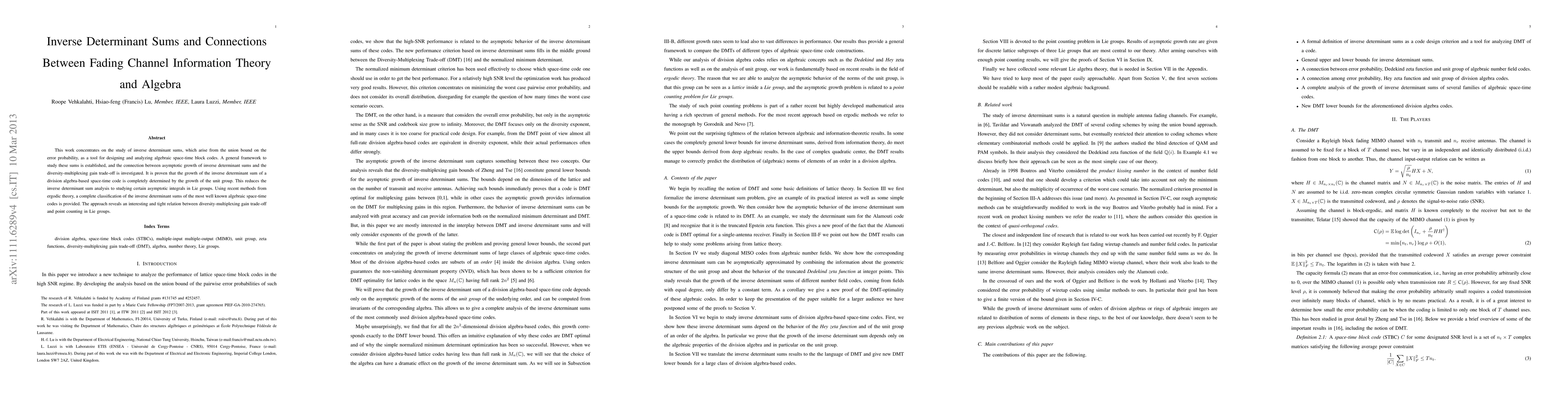 This work concentrates on the study of inverse determinant sums, which arise from the union bound on the error probability, as a tool for designing and analyzing algebraic space-time block codes. A general framework to study these sums is established, and the connection between asymptotic growth of inverse determinant sums and the diversity-multiplexing gain trade-off is investigated. It is proven that the growth of the inverse determinant sum of a division algebra-based space-time code is completely determined by the growth of the unit group. This reduces the inverse determinant sum analysis to studying certain asymptotic integrals in Lie groups. Using recent methods from ergodic theory, a complete classification of the inverse determinant sums of the most well known algebraic space-time codes is provided. The approach reveals an interesting and tight relation between diversity-multiplexing gain trade-off and point counting in Lie groups.