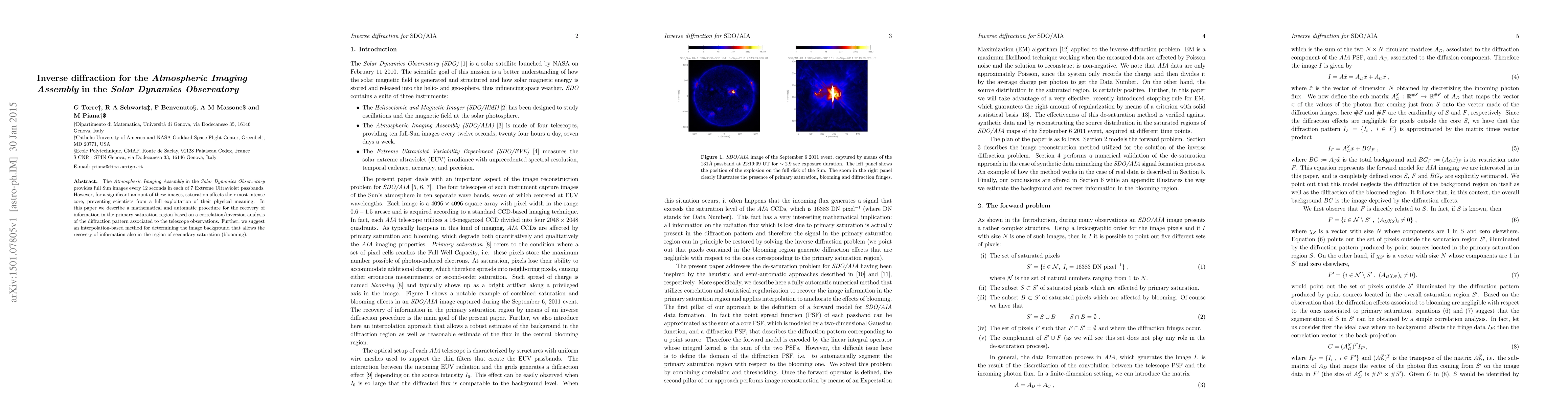 This paper proposes a mathematical method to recover lost information in saturated regions of solar images from the Atmospheric Imaging Assembly on the Solar Dynamics Observatory, using diffraction pattern analysis and an interpolation technique to address both primary and secondary saturation issues.
