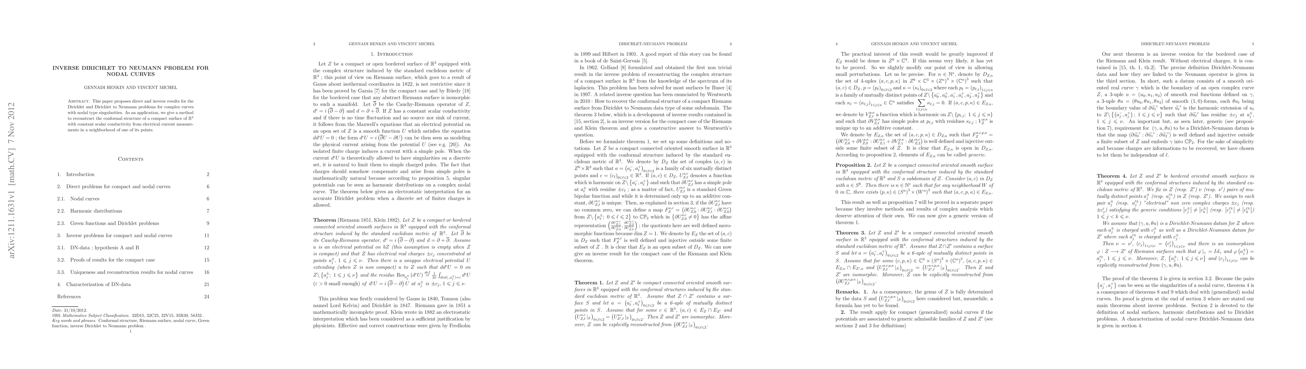 This paper presents solutions for the Dirichlet and Dirichlet to Neumann problems along complex curves with nodal singularities, and applies these results to reconstruct the conformal structure of a compact surface in 3D Euclidean space using electrical current measurements.