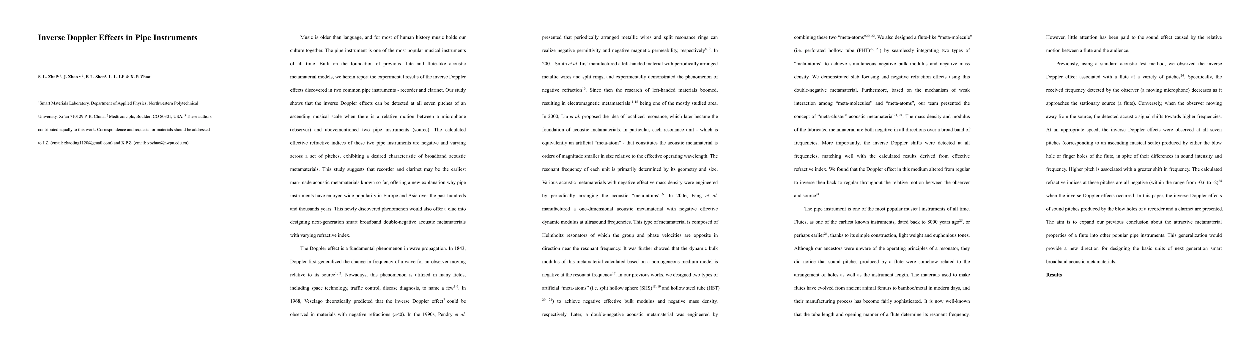 Music is older than language, and for most of human history music holds our culture together. The pipe instrument is one of the most popular musical instruments of all time. Built on the foundation of previous flute and flute-like acoustic metamaterial models, we herein report the experimental results of the inverse Doppler effects discovered in two common pipe instruments - recorder and clarinet. Our study shows that the inverse Doppler effects can be detected at all seven pitches of an ascending musical scale when there is a relative motion between a microphone (observer) and abovementioned two pipe instruments (source). The calculated effective refractive indices of these two pipe instruments are negative and varying across a set of pitches, exhibiting a desired characteristic of broadband acoustic metamaterials. This study suggests that recorder and clarinet may be the earliest man-made acoustic metamaterials known so far, offering a new explanation why pipe instruments have enjoyed wide popularity in Europe and Asia over the past hundreds and thousands years. This newly discovered phenomenon would also offer a clue into designing next-generation smart broadband double-negative acoustic metamaterials with varying refractive index.