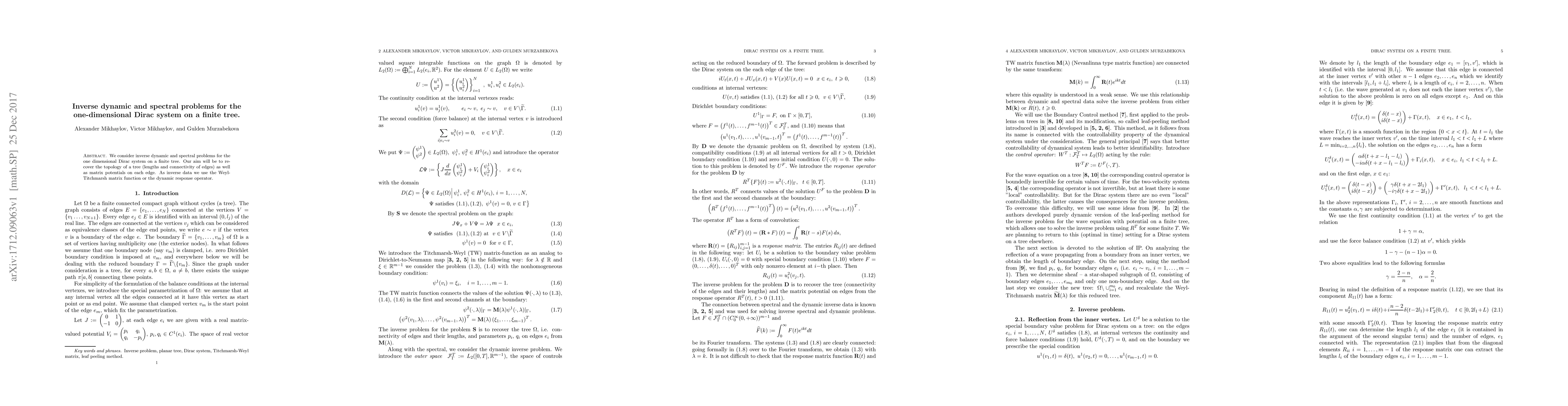 This paper addresses inverse dynamic and spectral problems for the one-dimensional Dirac system on a finite tree, aiming to reconstruct the tree's topology and matrix potentials using the Weyl-Titchmarsh matrix function or the dynamic response operator as inverse data.