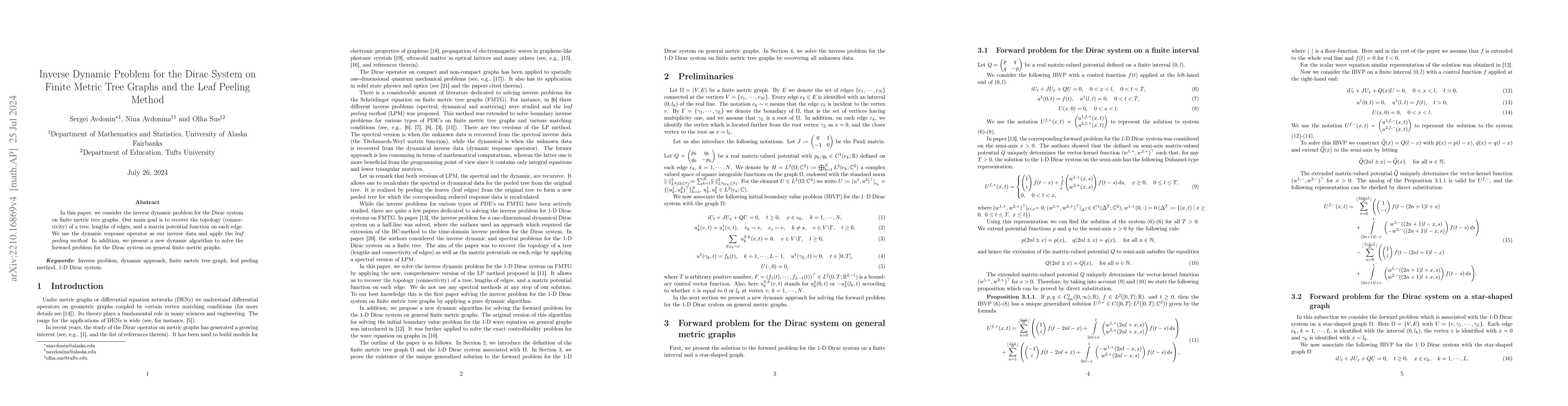 This paper addresses the inverse dynamic problem for a 1-D Dirac system on finite metric tree graphs, aiming to recover the tree's topology, edge lengths, and potential function using a Leaf peeling algorithm. It also introduces a new dynamic algorithm to solve the forward problem for the 1-D Dirac system on such graphs.