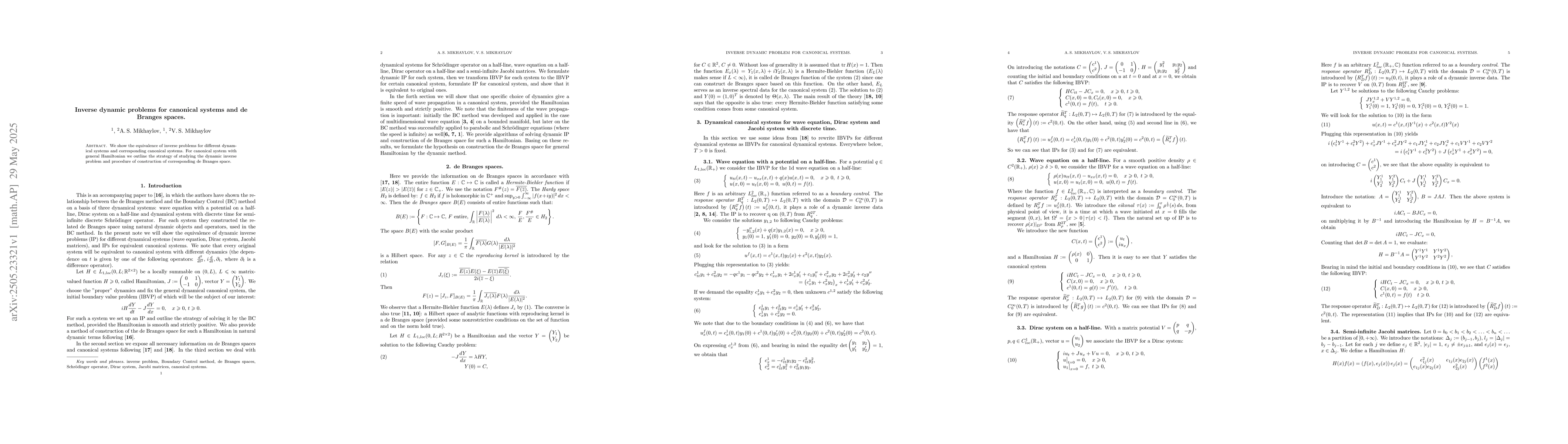 The paper establishes equivalence between inverse problems for various dynamical systems and their corresponding canonical systems, outlining a strategy for studying dynamic inverse problems and constructing de Branges spaces for a general Hamiltonian canonical system.