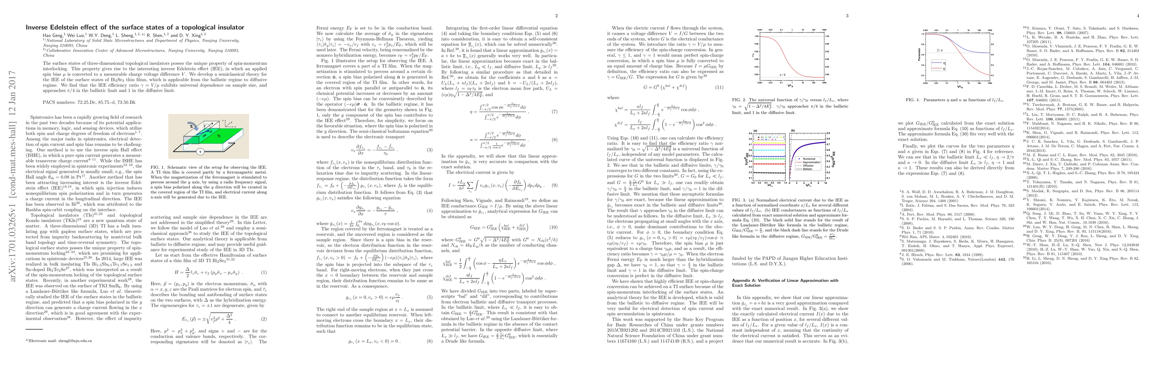 The surface states of three-dimensional topological insulators posses the unique property of spin-momentum interlocking. This property gives rise to the interesting inverse Edelstein effect (IEE), in which an applied spin bias $\mu$ is converted to a measurable charge voltage difference $V$. We develop a semiclassical theory for the IEE of the surface states of $\text{Bi}_2\text{Se}_3$ thin films, which is applicable from the ballistic regime to diffusive regime. We find that the IEE efficiency ratio $\gamma=V/\mu$ exhibits universal dependence on sample size, and approaches $\pi/4$ in the ballistic limit and $1$ in the diffusive limit.